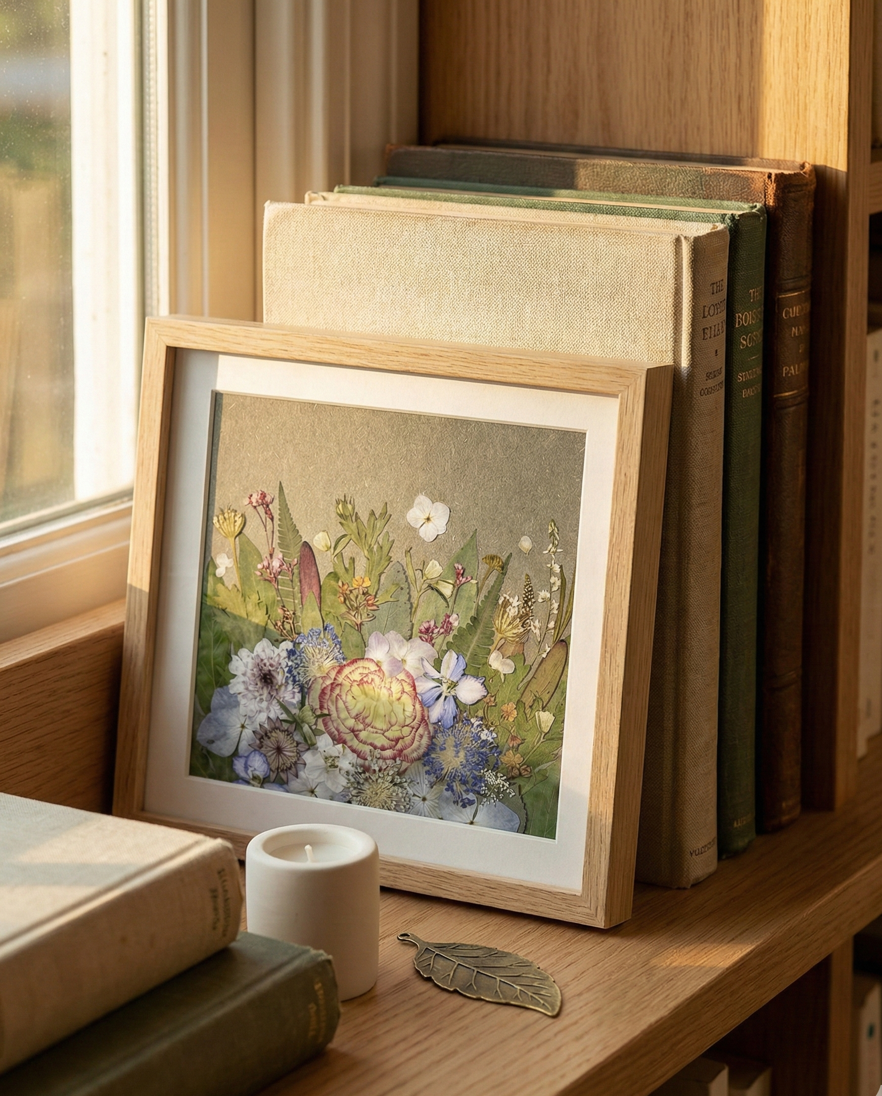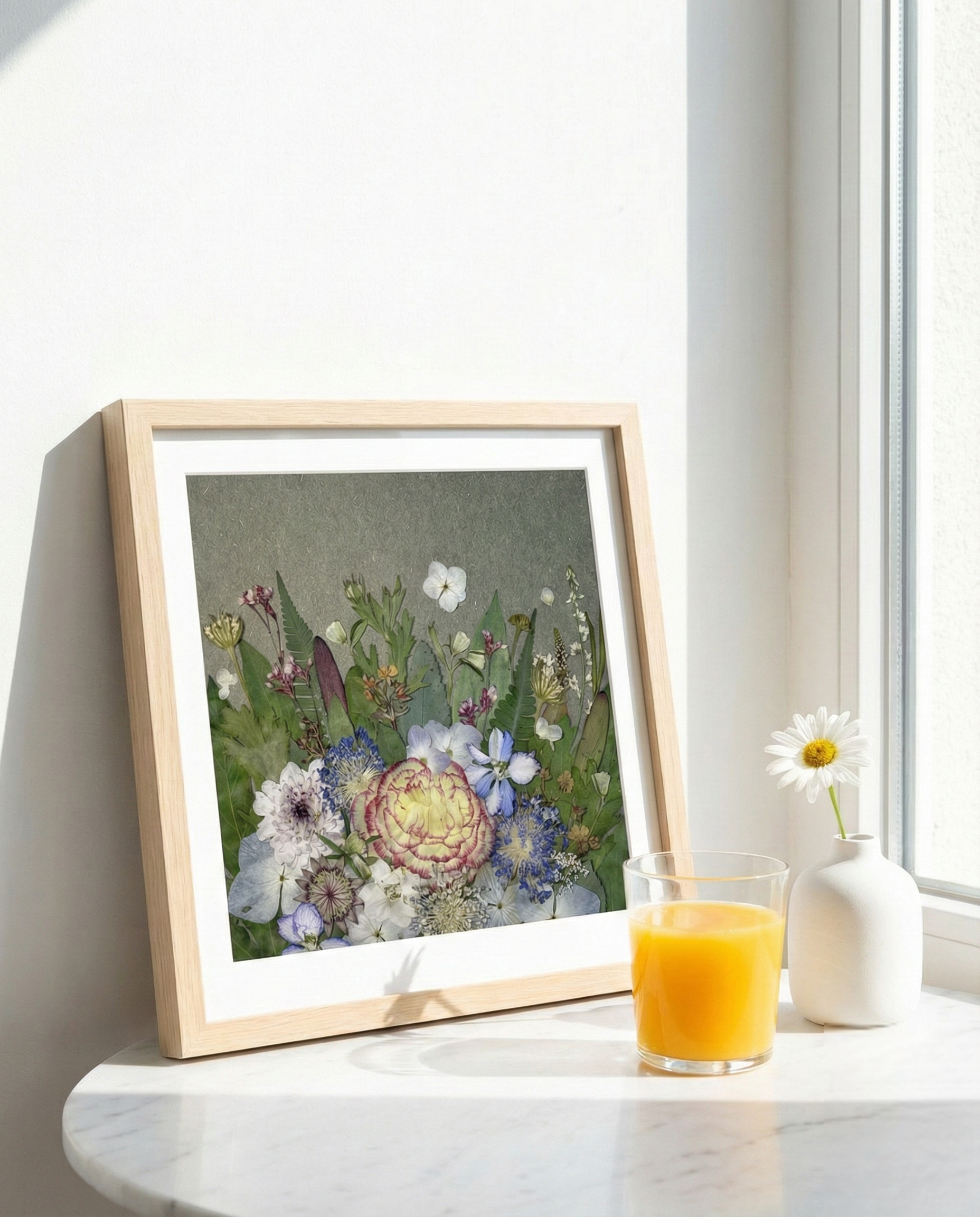 Opera d’arte con fiori pressati in cornice da 25 × 25 cm, ideale come decorazione da tavolo.