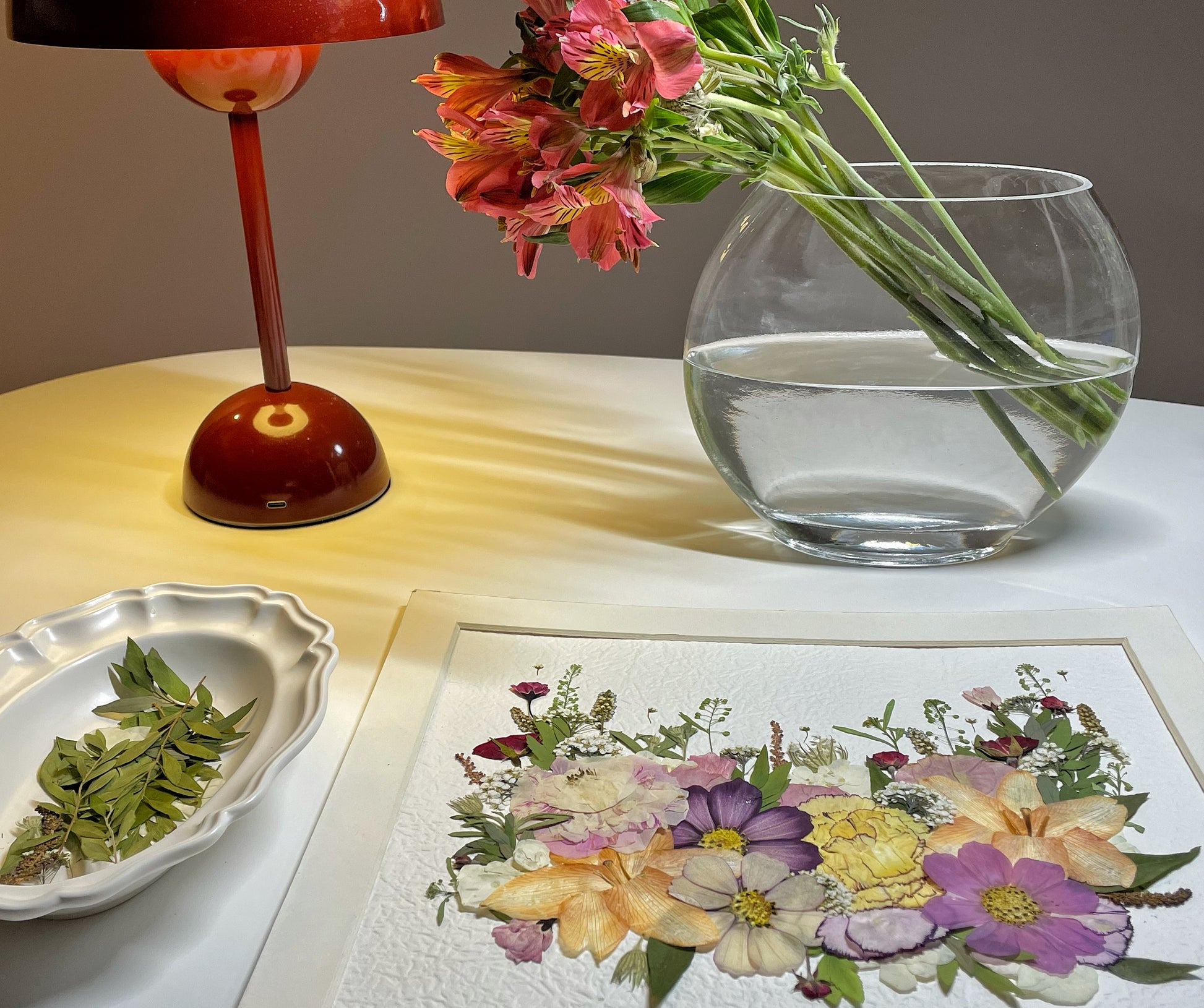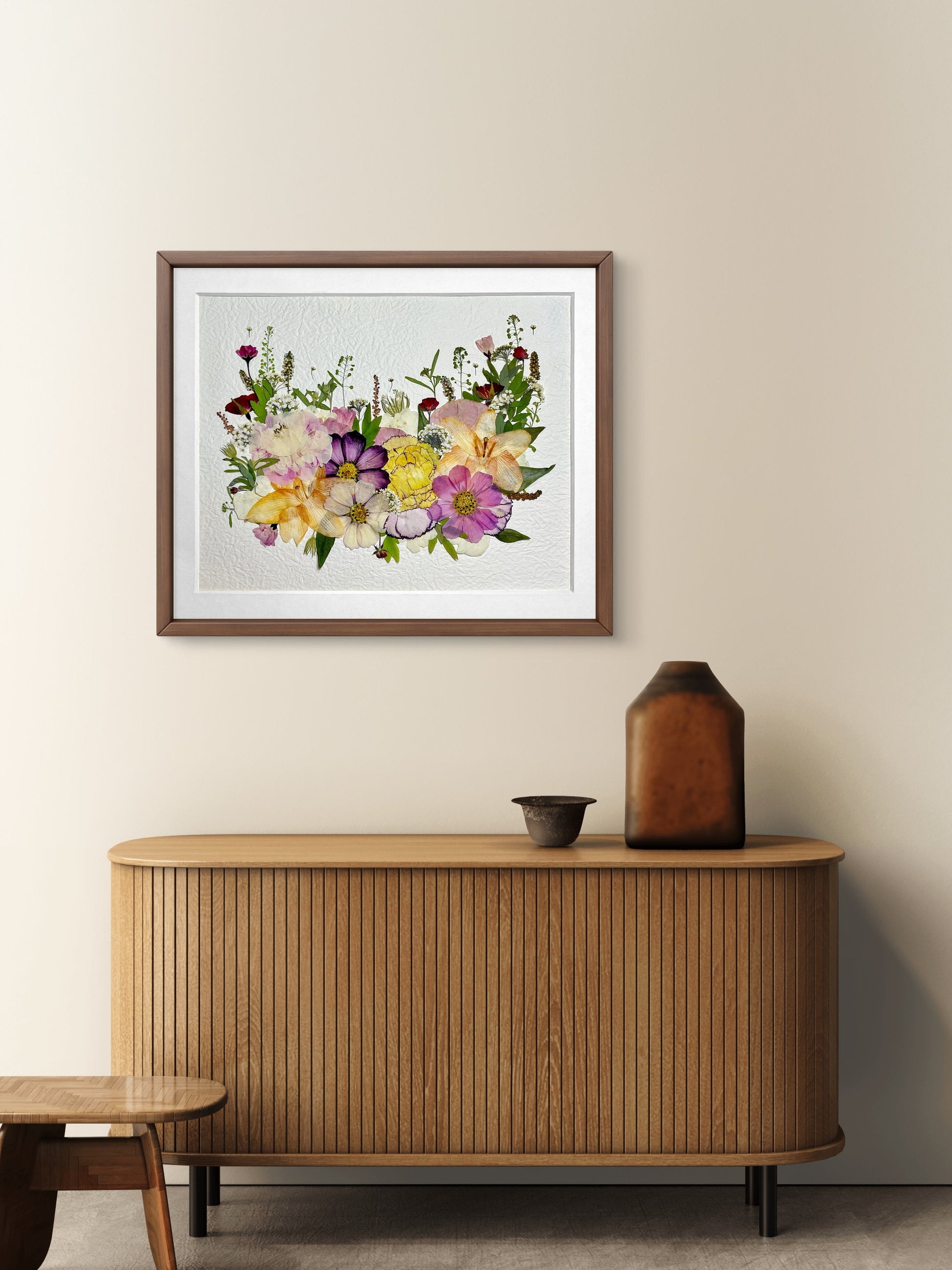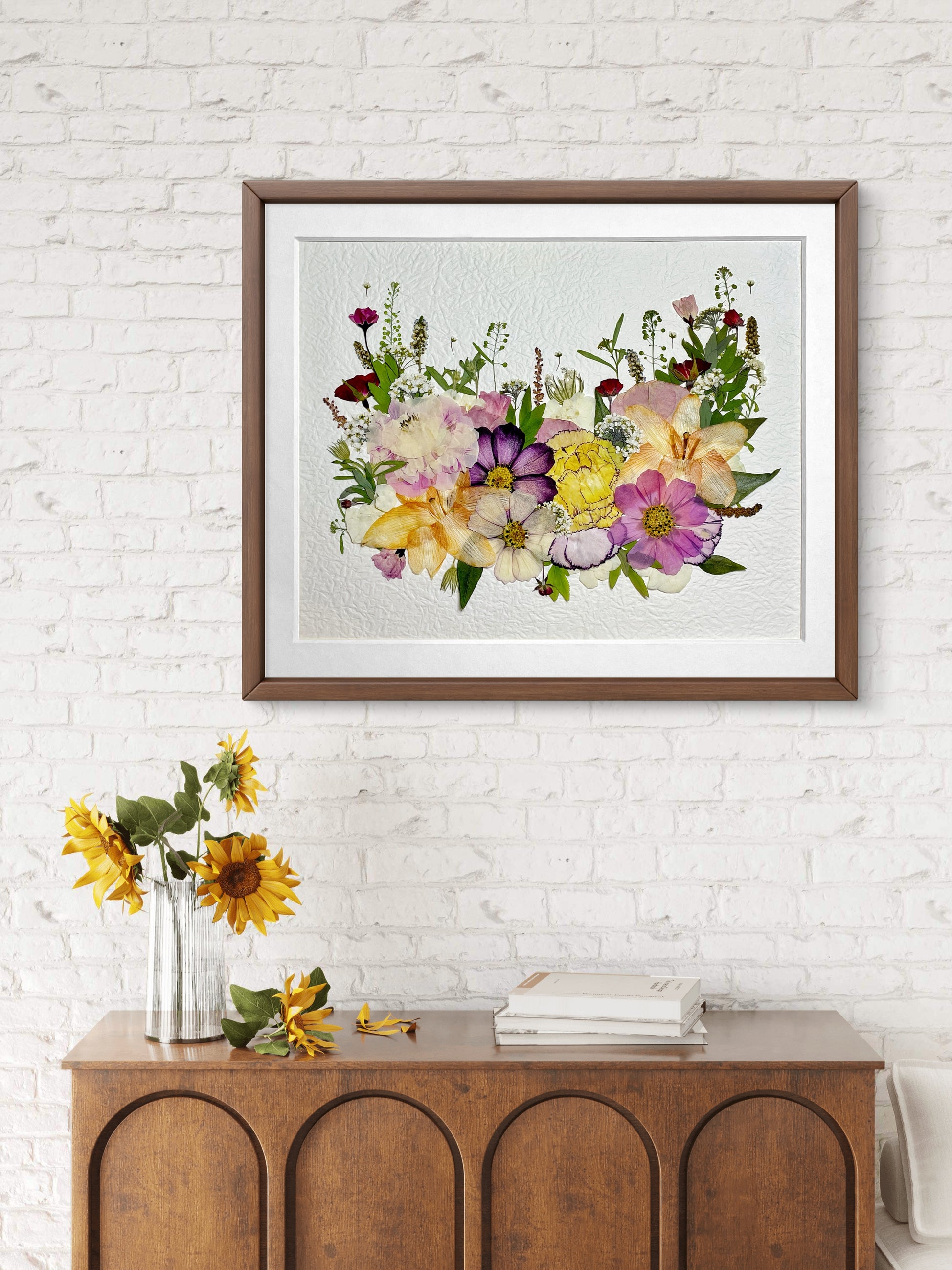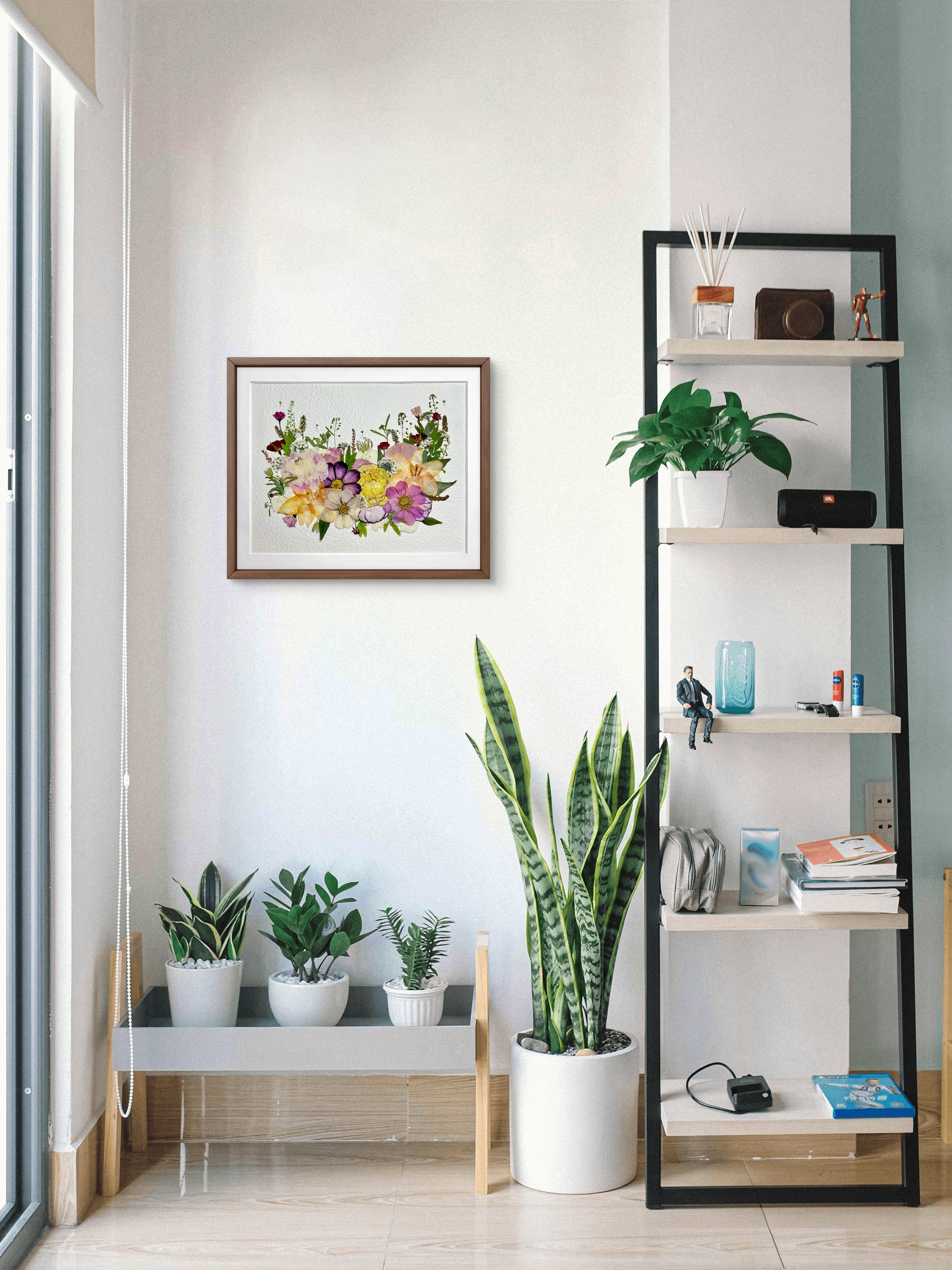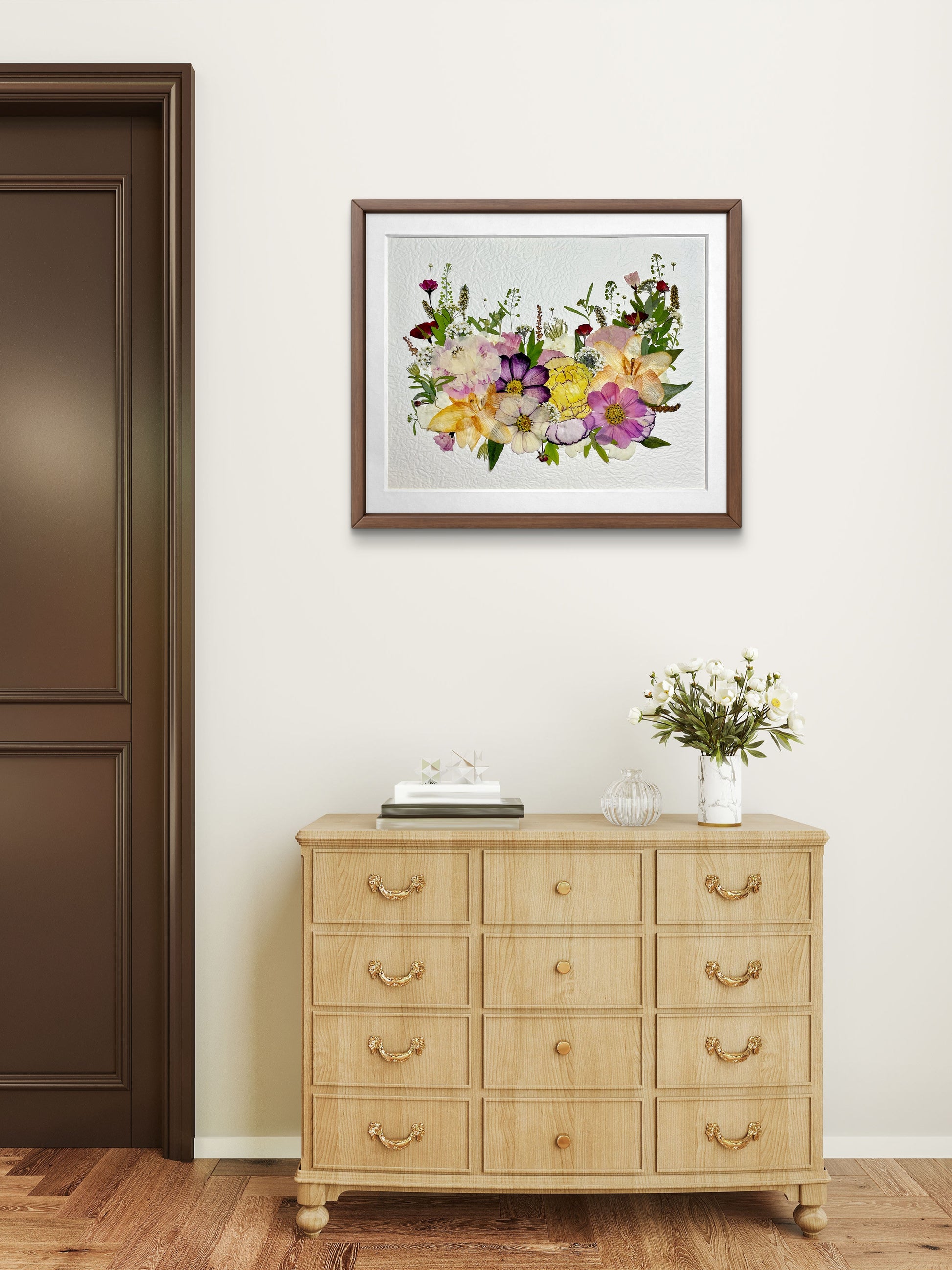 ▪ Product details: This is a mid-size pressed floral frame art, displaying the arrangement perfectly against the background paper. Our frames are crafted with our flower florists meticulously selecting the finest seasonal blooms. The material we use is 100% flowers and plants.