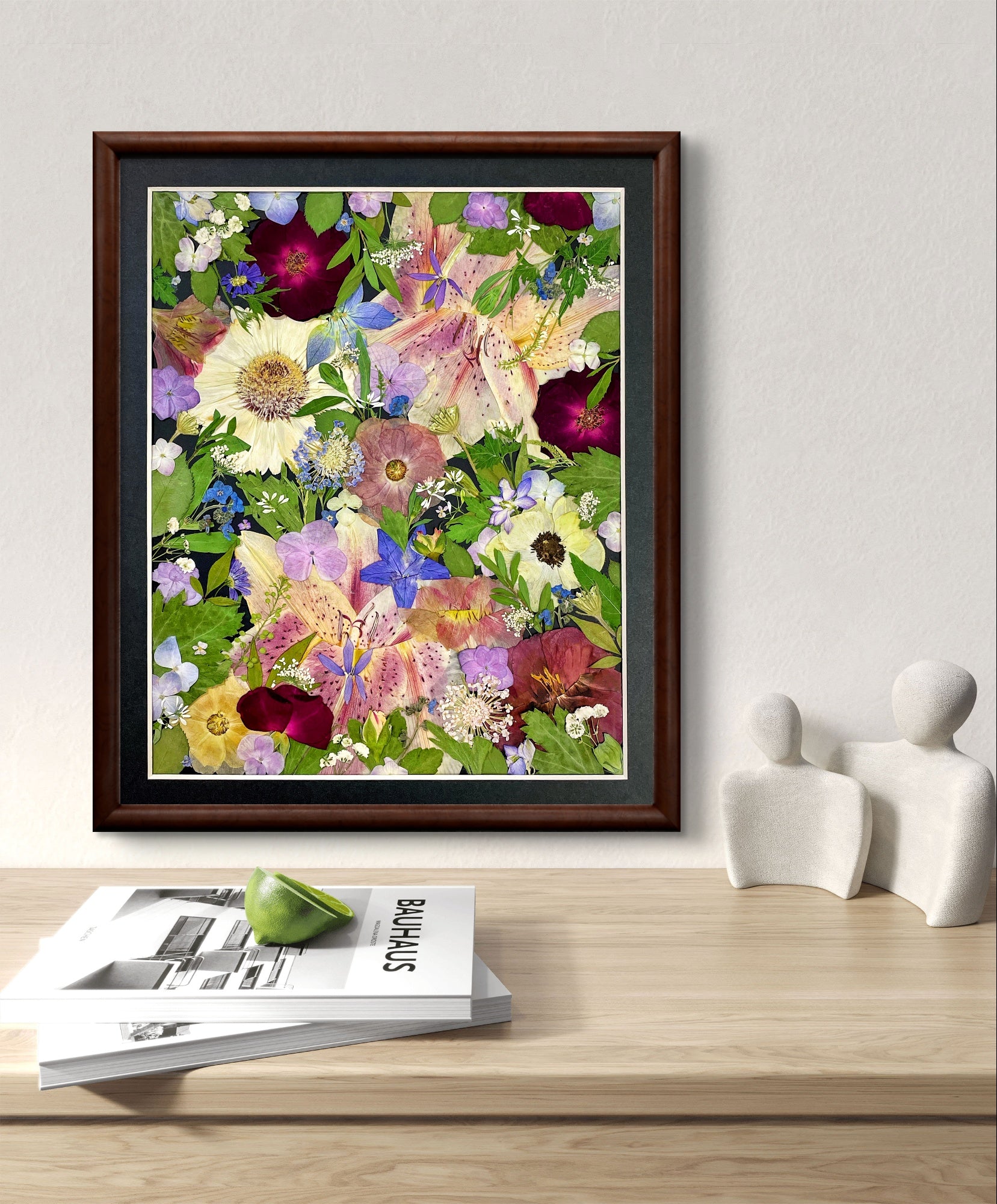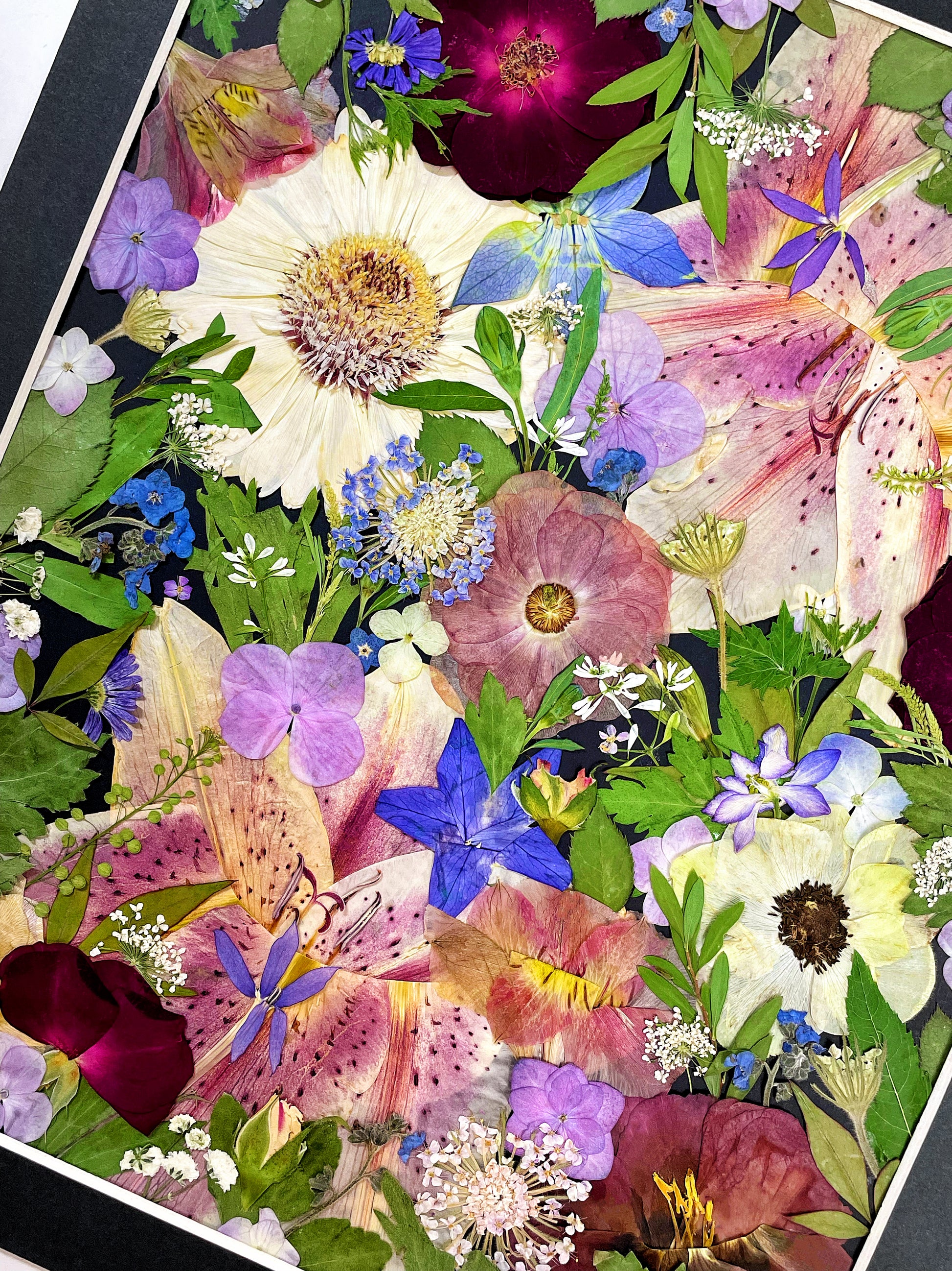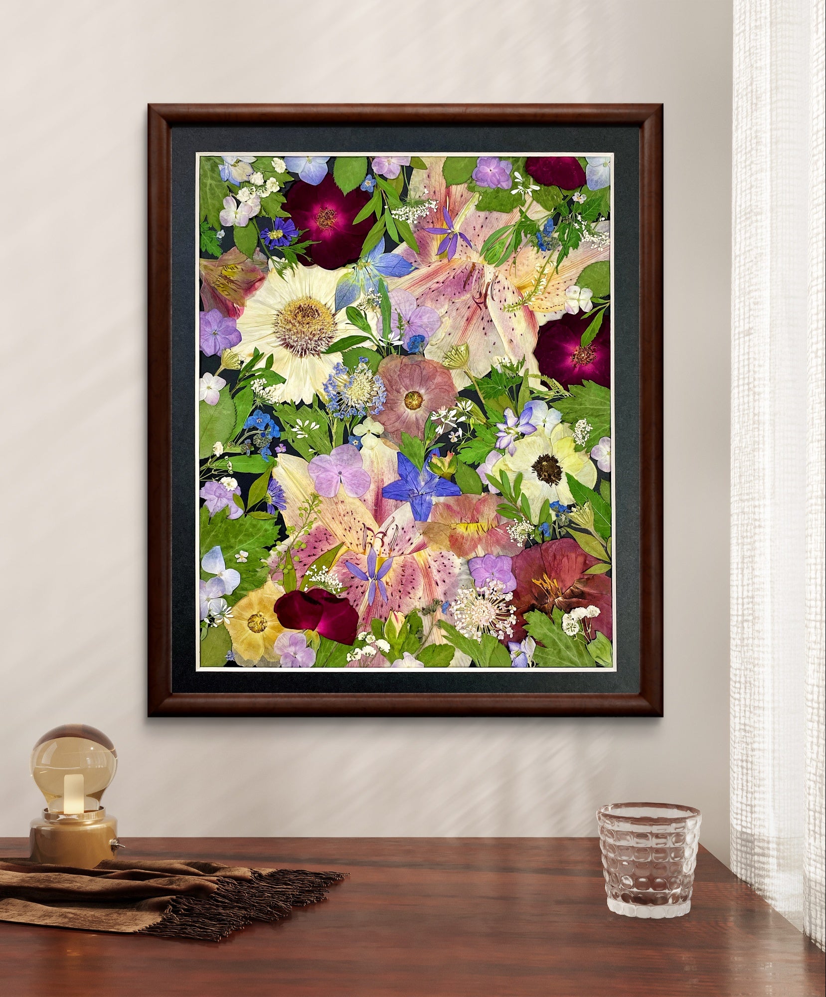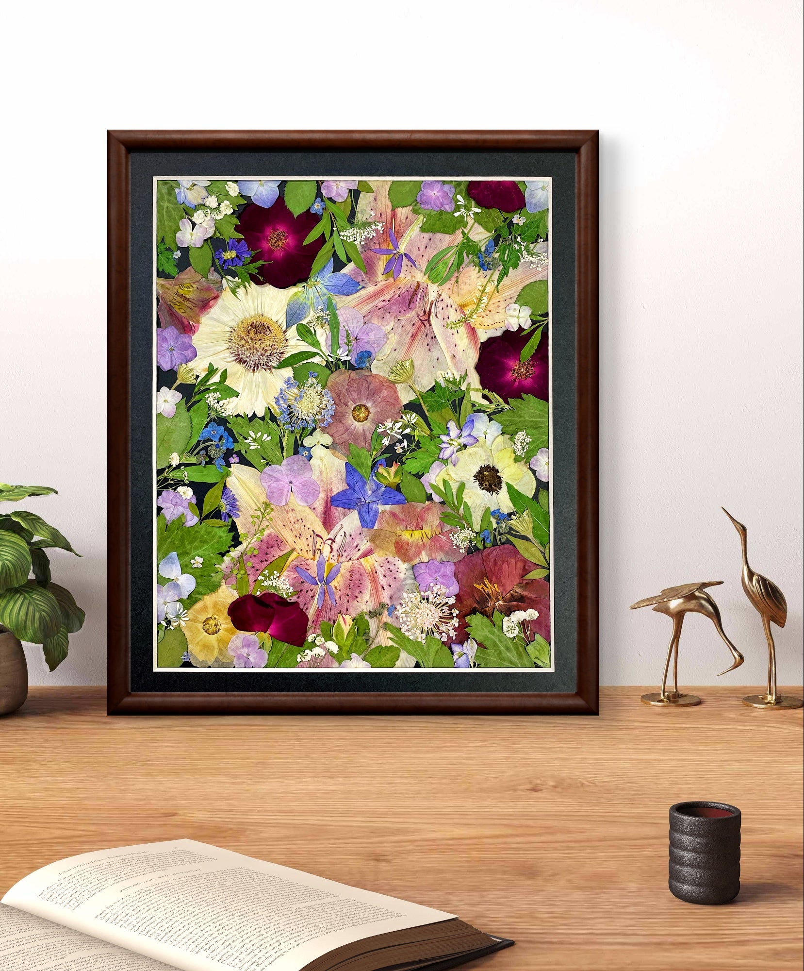 ▪ Product details: This is a small-sized pressed floral frame art, displaying the arrangement perfectly against the black background paper, covered by clear acrylic board. Our frames are crafted from beautiful 100% hardwood, with our flower florists meticulously selecting the finest seasonal blooms. The material we use is 100% flowers and plants.