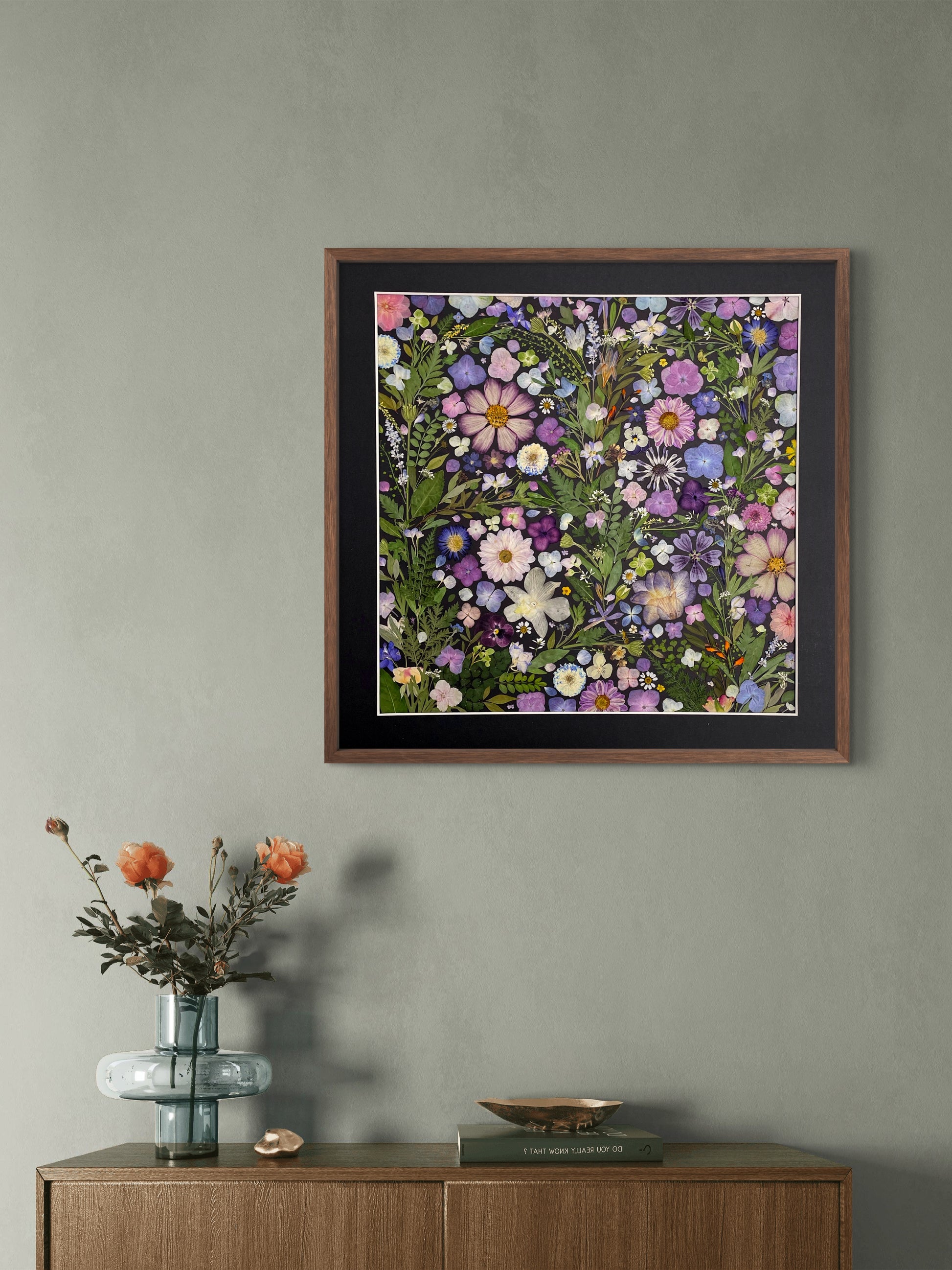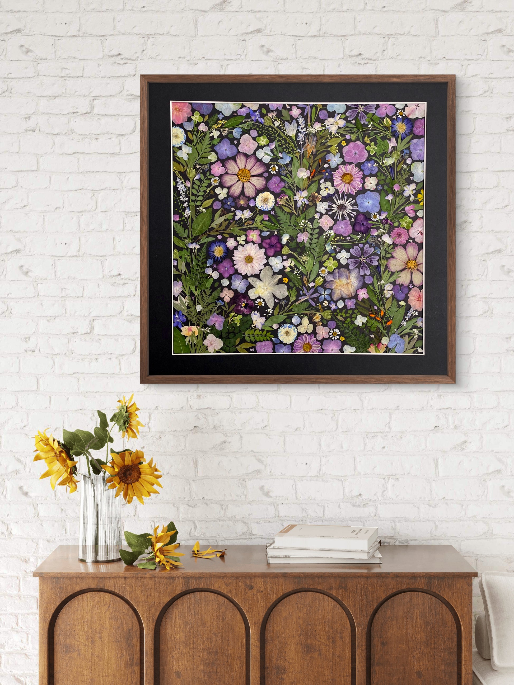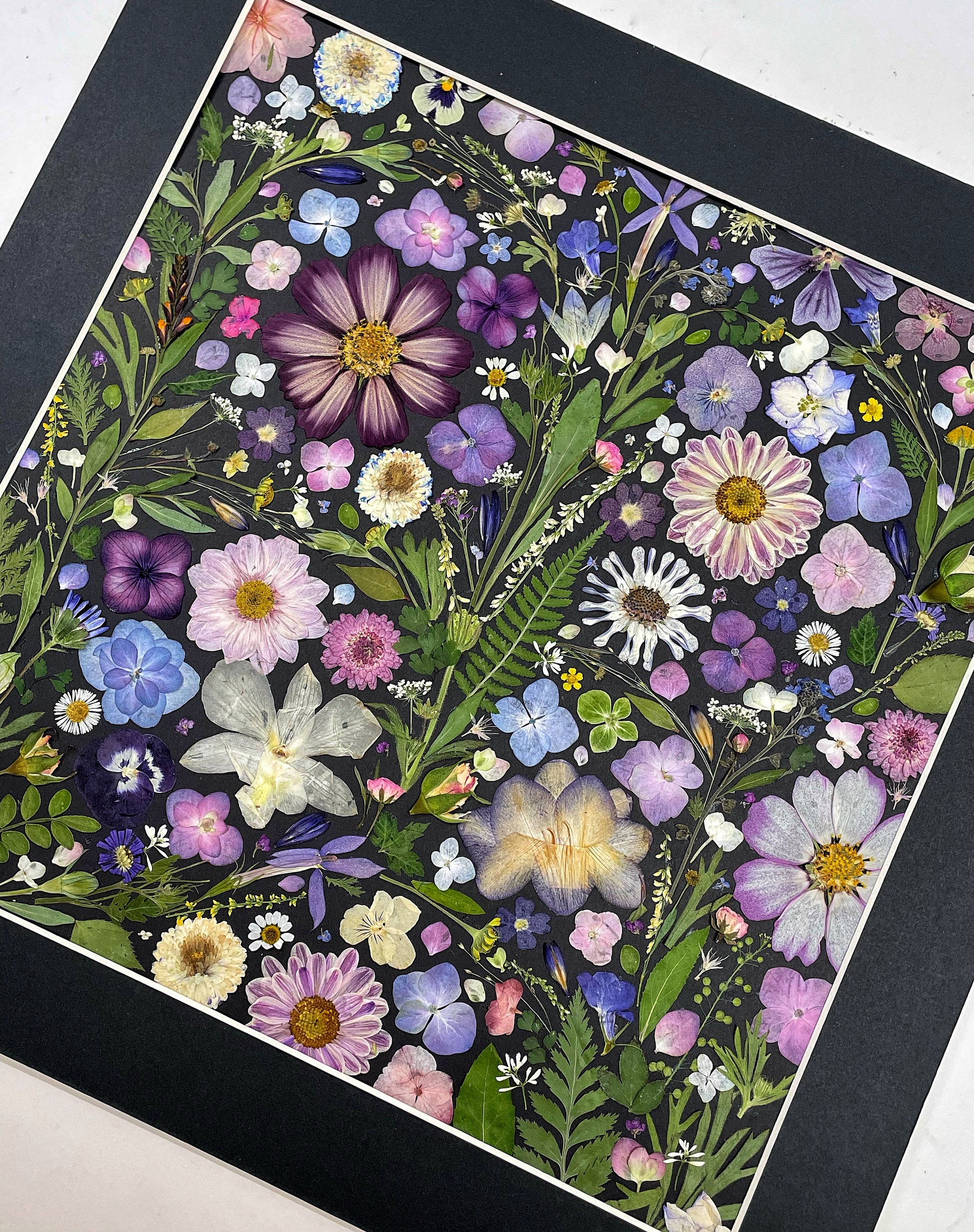 Our florist carefully arranges and glues dried flower petals onto background paper, creating a unique design. Each petal is selected from the finest seasonal blooms, meticulously chosen by our skilled florists.