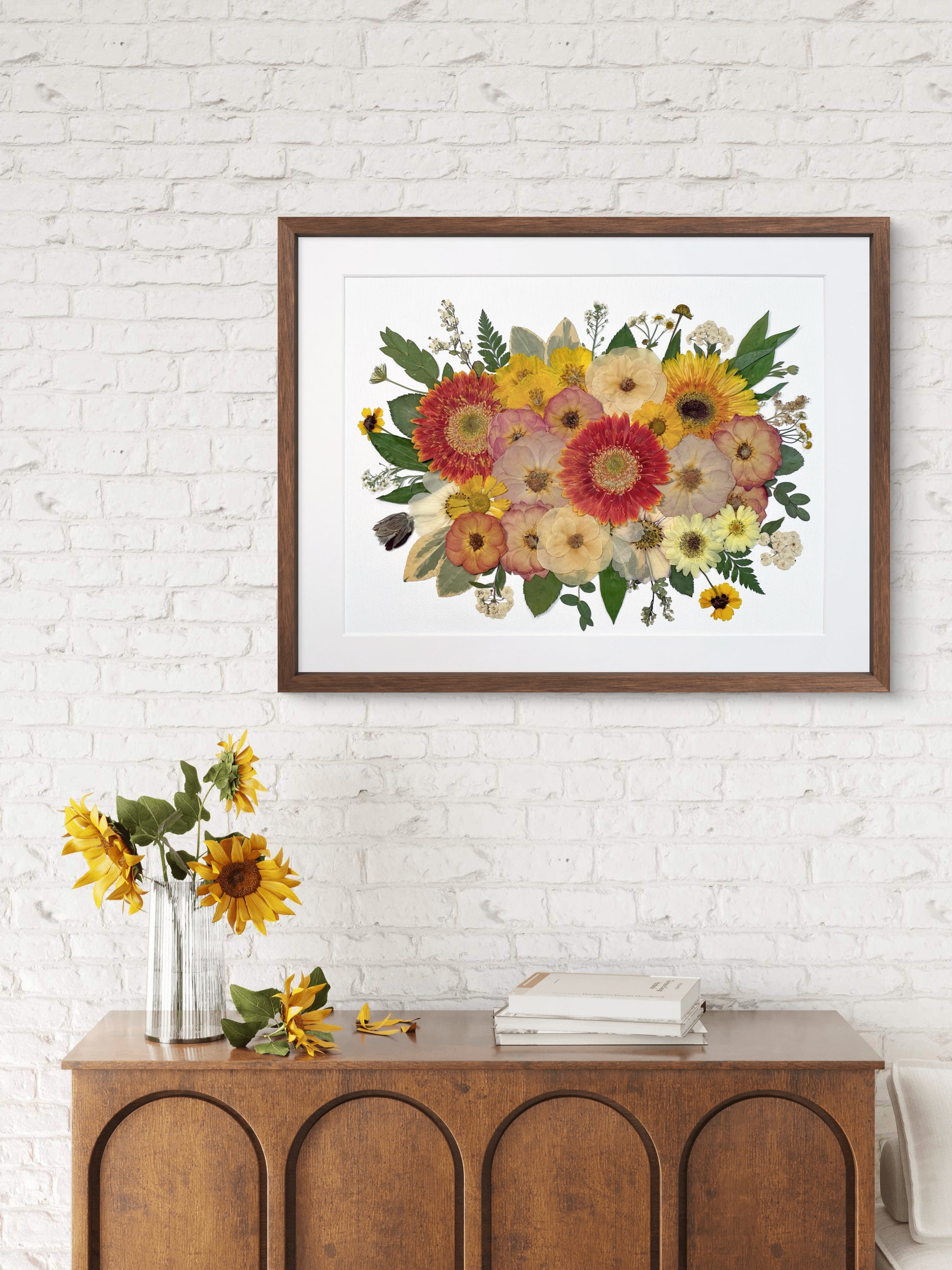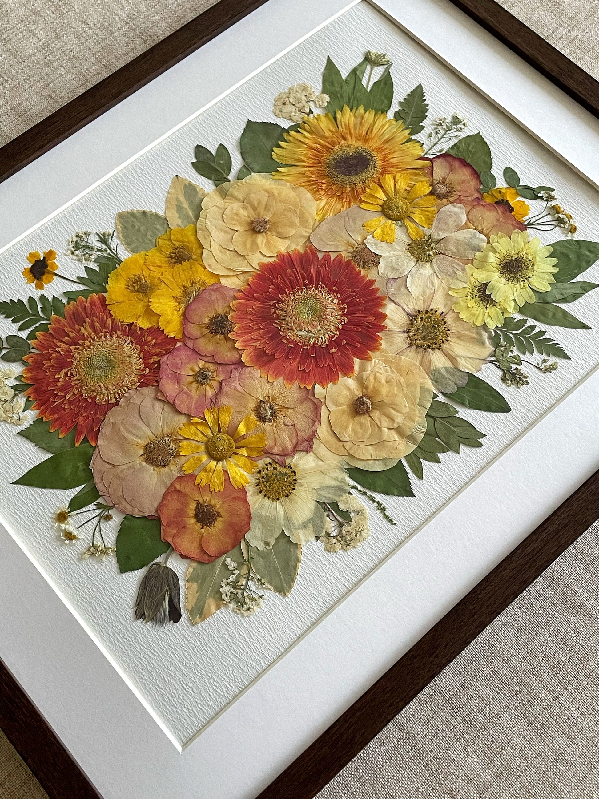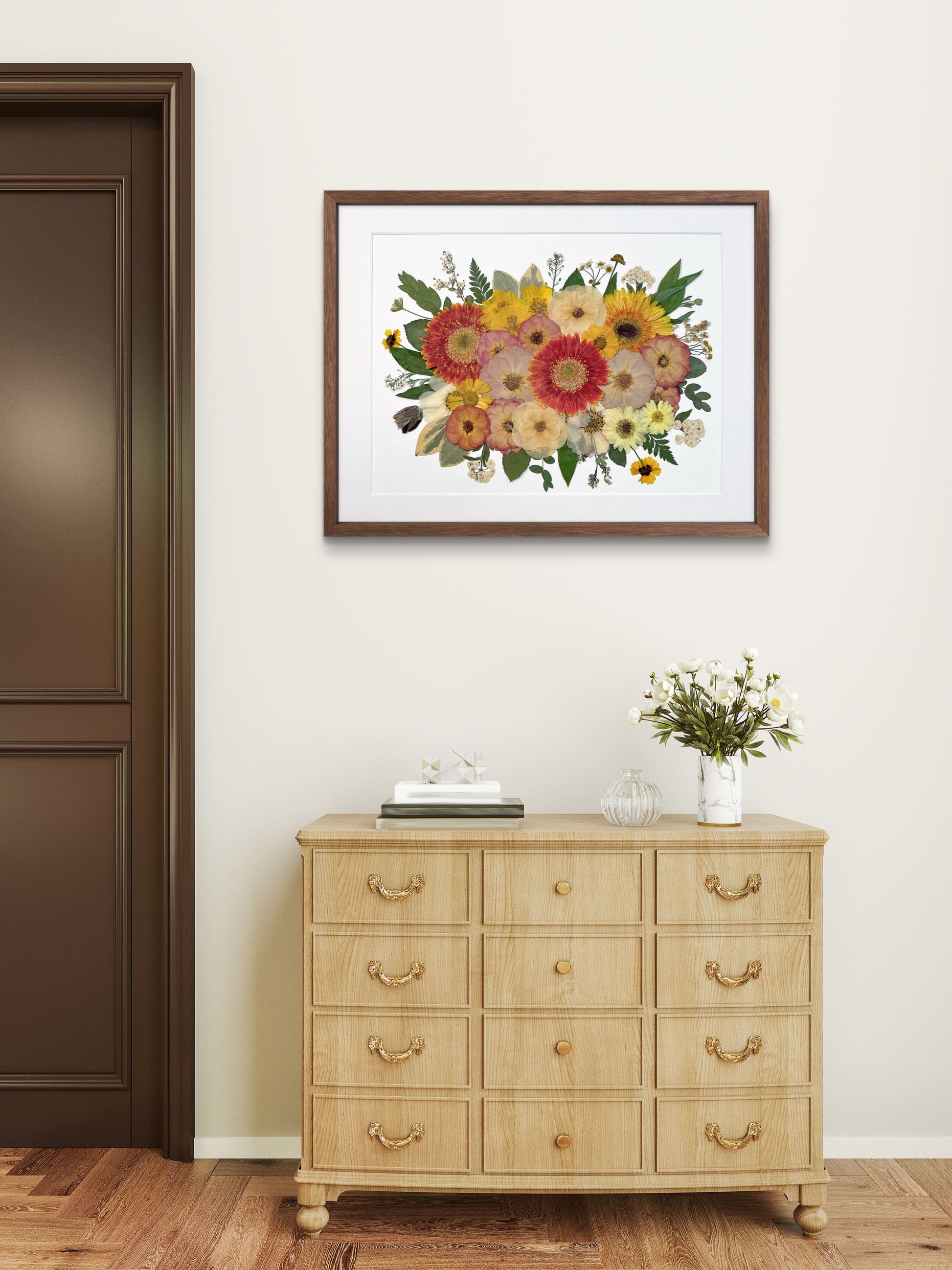 Product images features a 15.5"x 20" frame. Our florist carefully arranges and glues dried flower petals onto background paper, creating a unique design. Each petal is sourced from the finest seasonal blooms, meticulously chosen and pressed by our skilled florists.