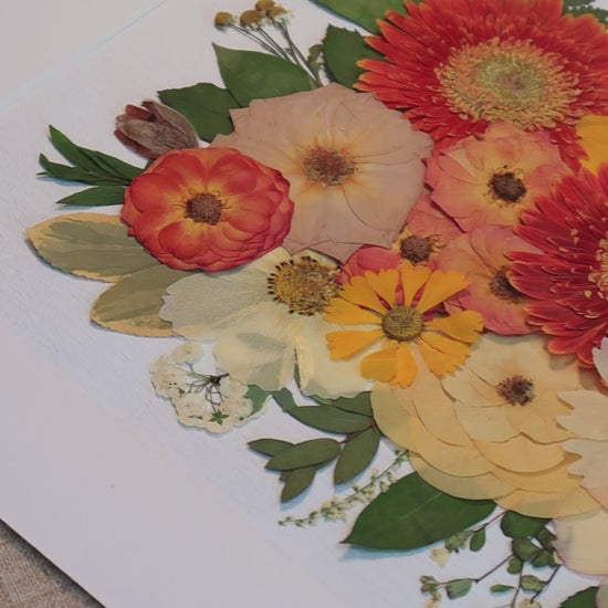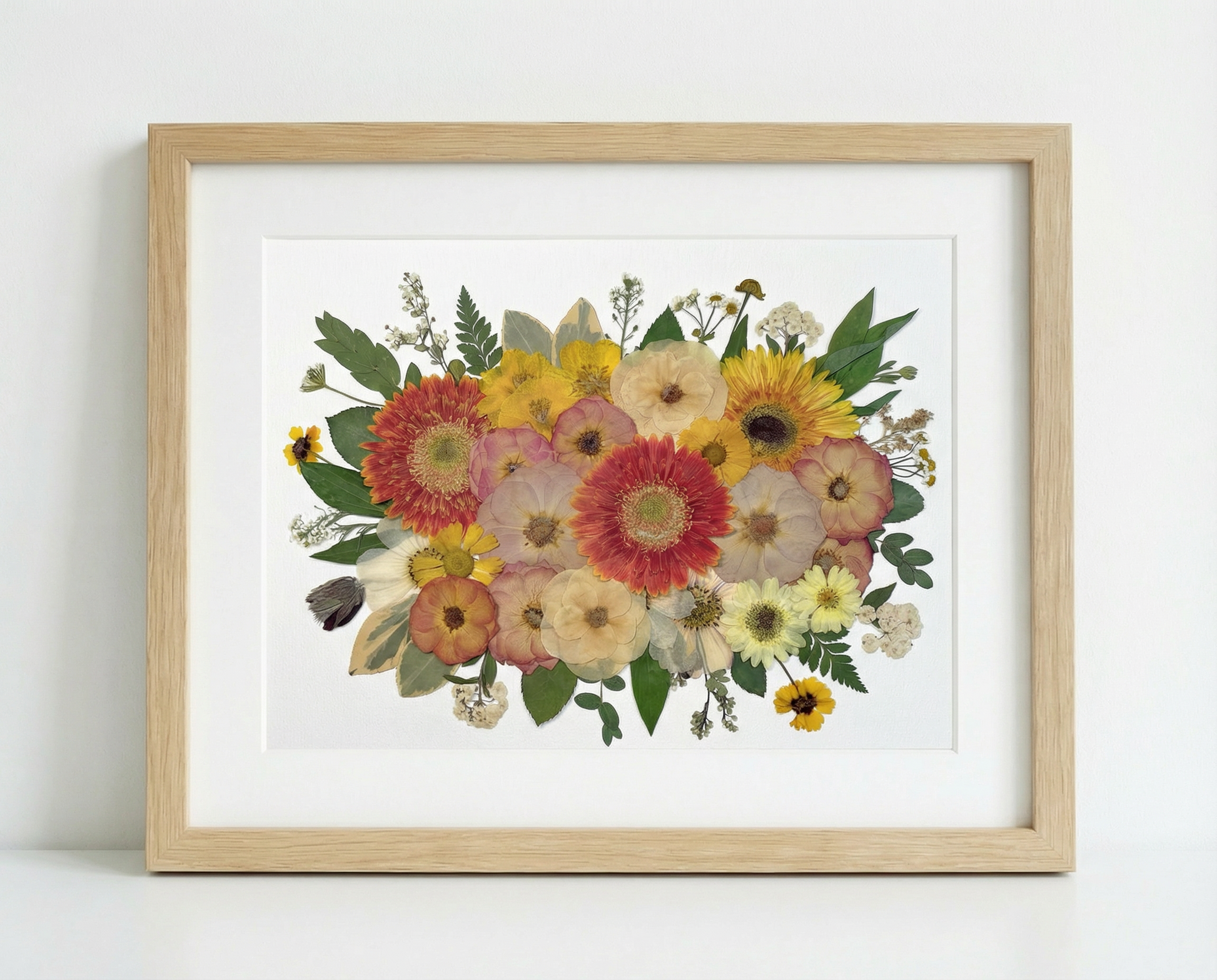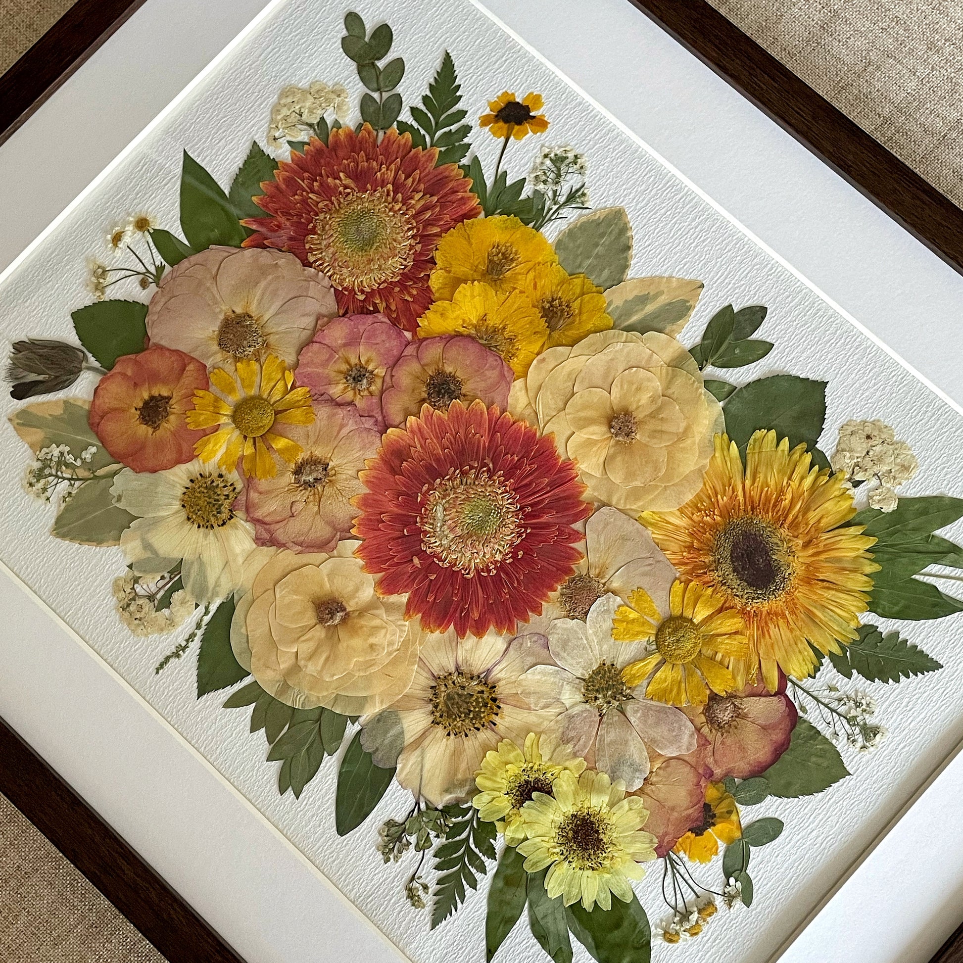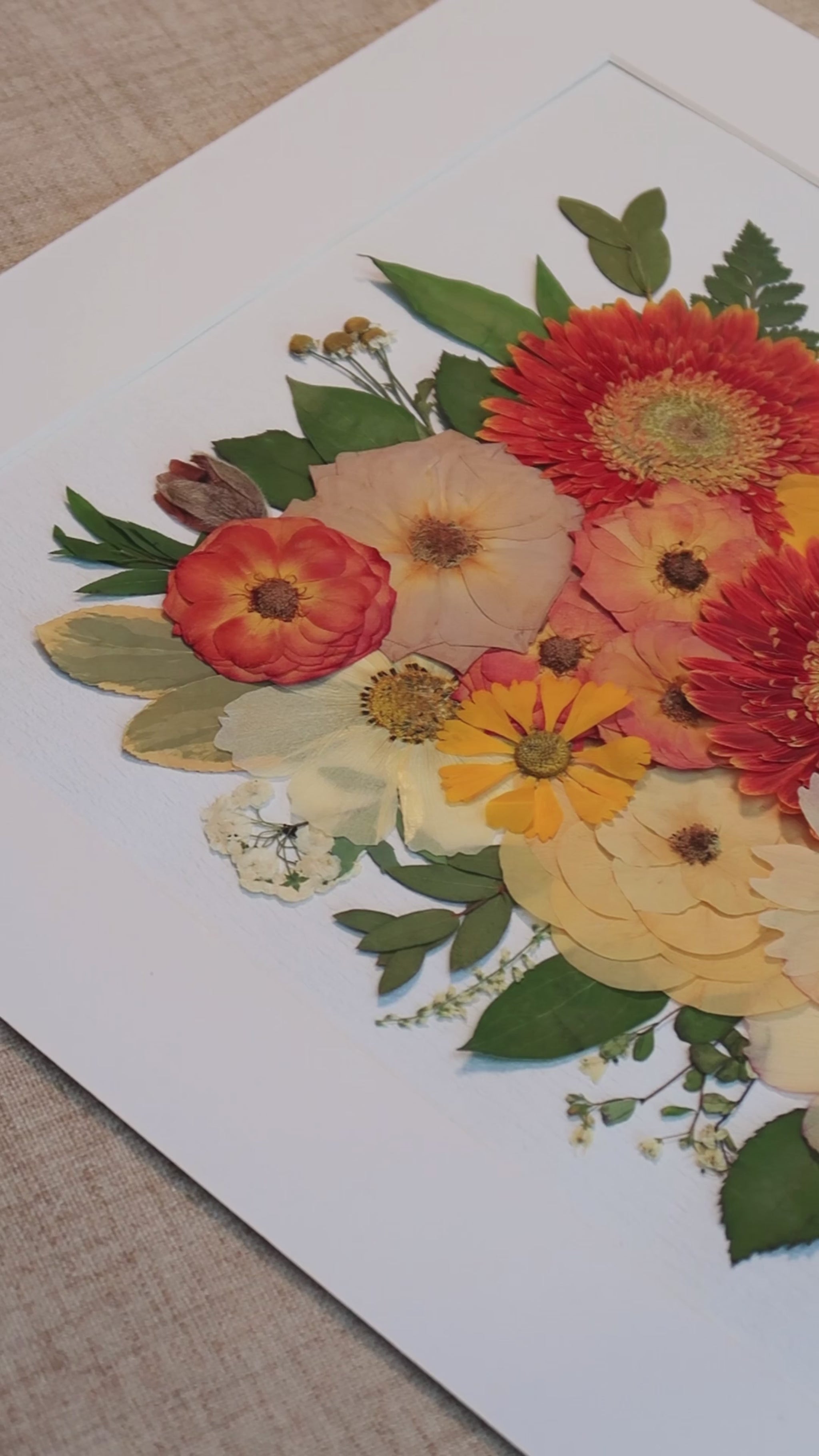 Product images features a 15.5"x 20" frame. Our florist carefully arranges and glues dried flower petals onto background paper, creating a unique design. Each petal is sourced from the finest seasonal blooms, meticulously chosen and pressed by our skilled florists.