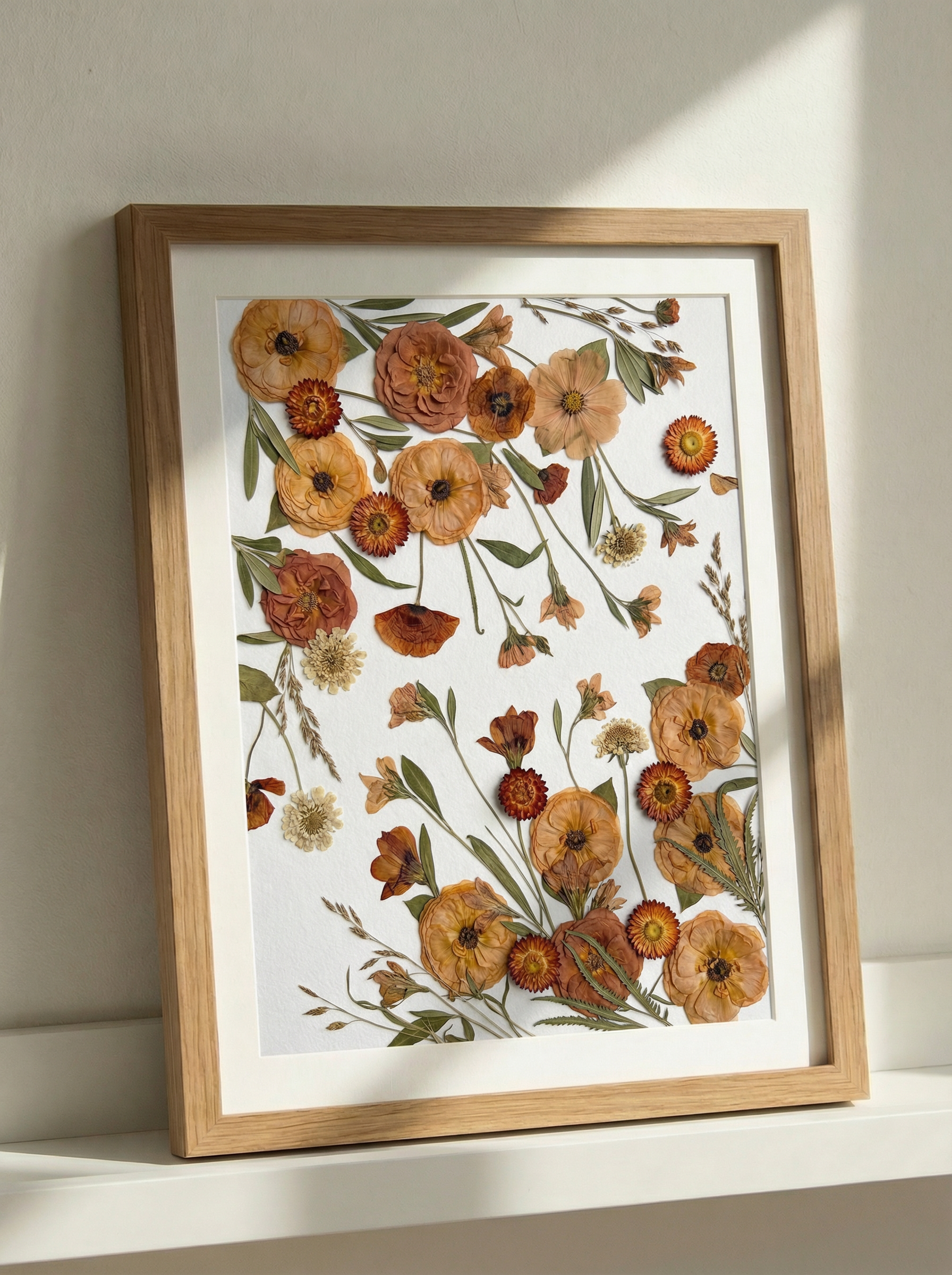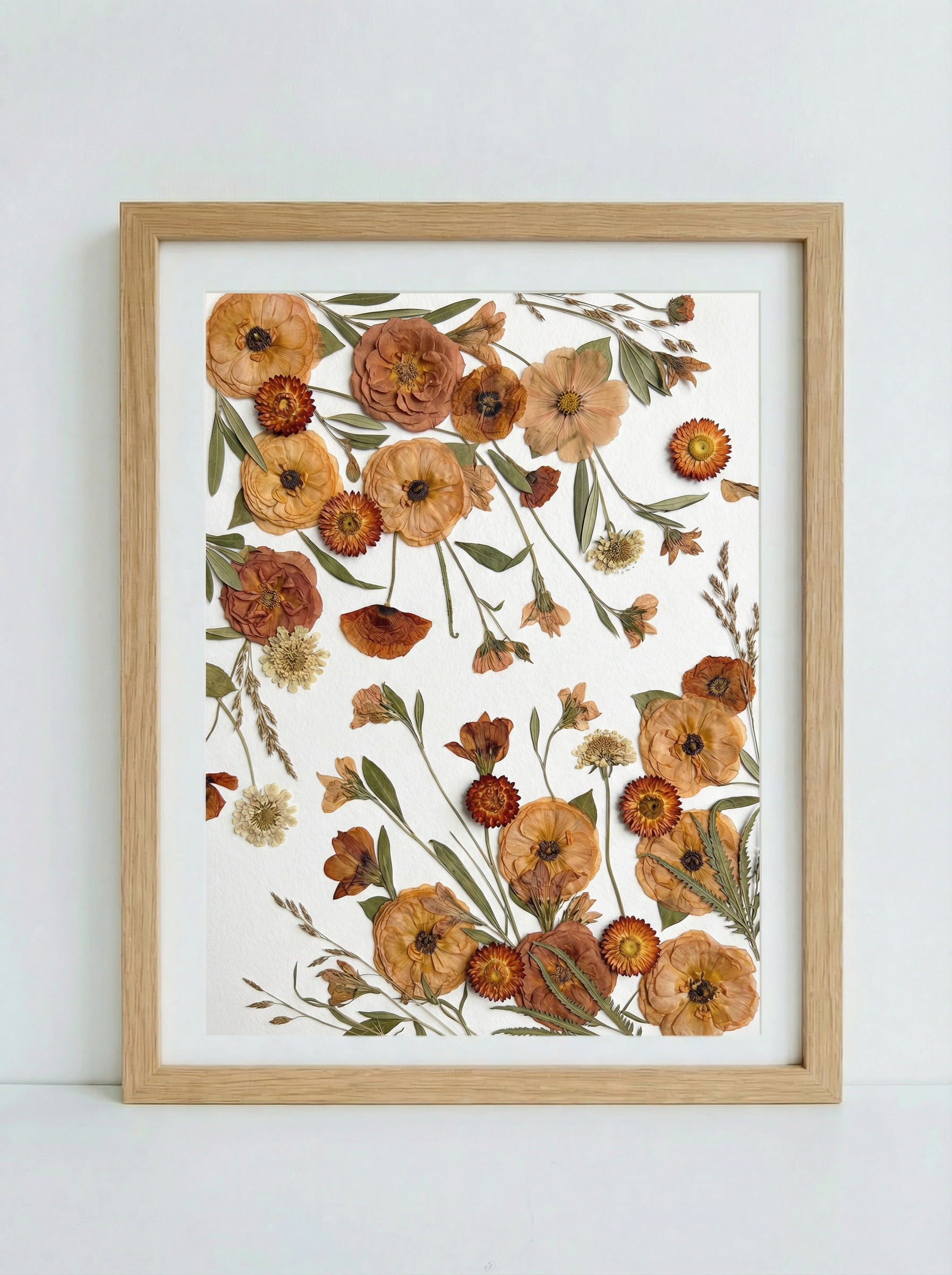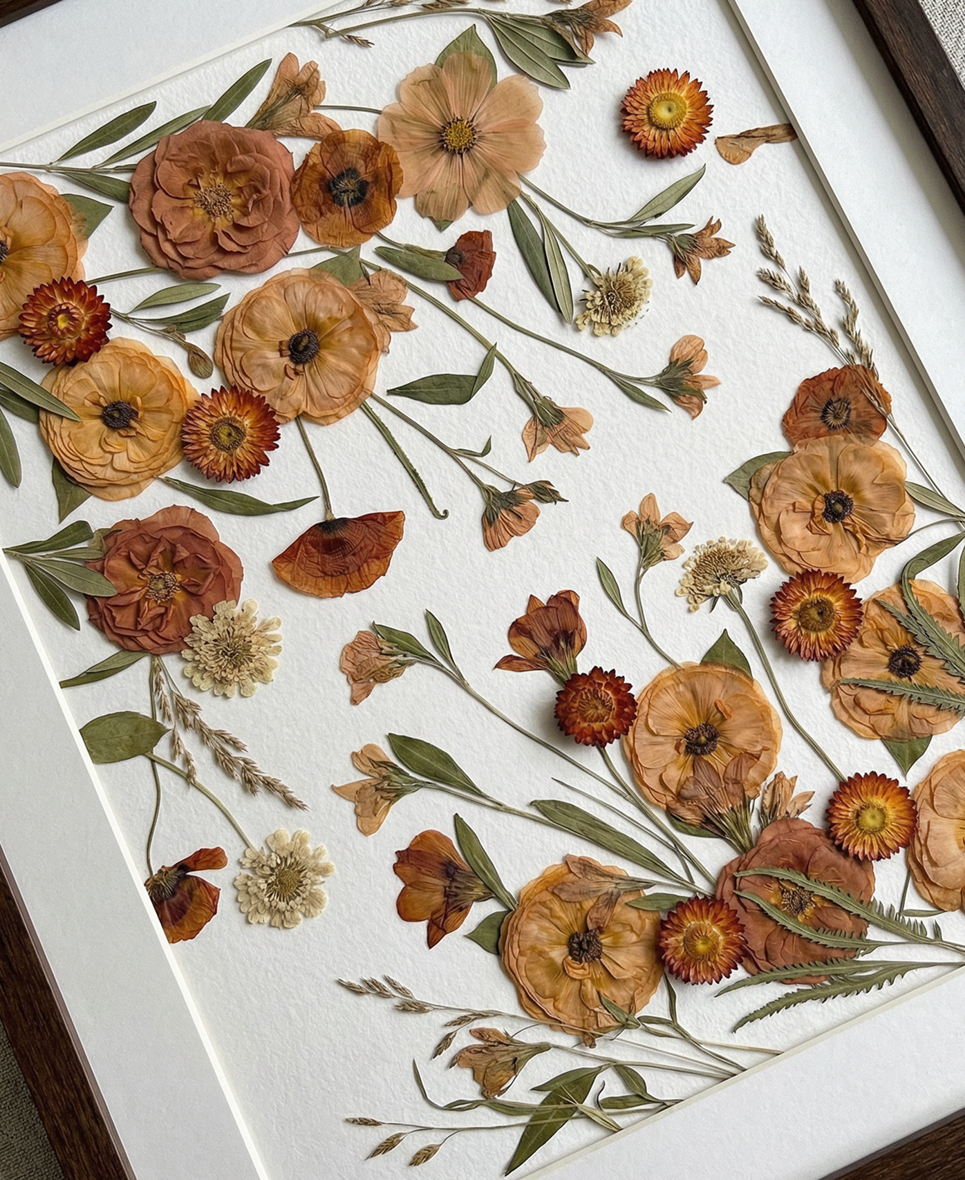 I nostri fioristi dispongono e incollano con cura petali di fiori essiccati su una base di carta, creando un design unico. Ogni petalo proviene dalle migliori fioriture stagionali, meticolosamente selezionate e pressate dai nostri esperti fioristi. L'opera è protetta da un pannello in acrilico trasparente e sigillata con un supporto in alluminio per aumentarne la longevità e preservarne la bellezza botanica.