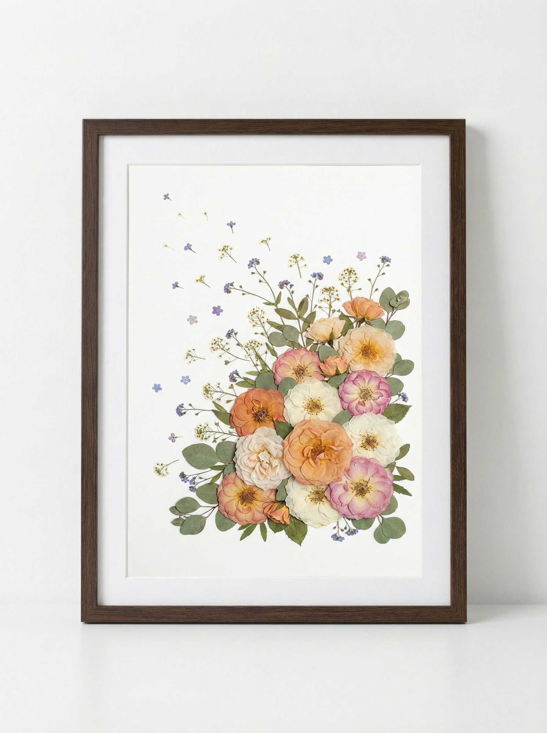 ▪ Dettagli del prodotto: Catturate l'essenza serena di un giardino eterno con il nostro "Eterno Sogno Fiorito". Questa squisita cornice preserva meticolosamente le vibranti tonalità delle rigogliose rose da giardino, i cui petali si schiudono in sfumature di pesca, crema e rosa cipria. Piccoli nontiscordardimé azzurri si spargono come sogni, mentre delicati ciuffi di gypsophila aggiungono una grazia eterea.