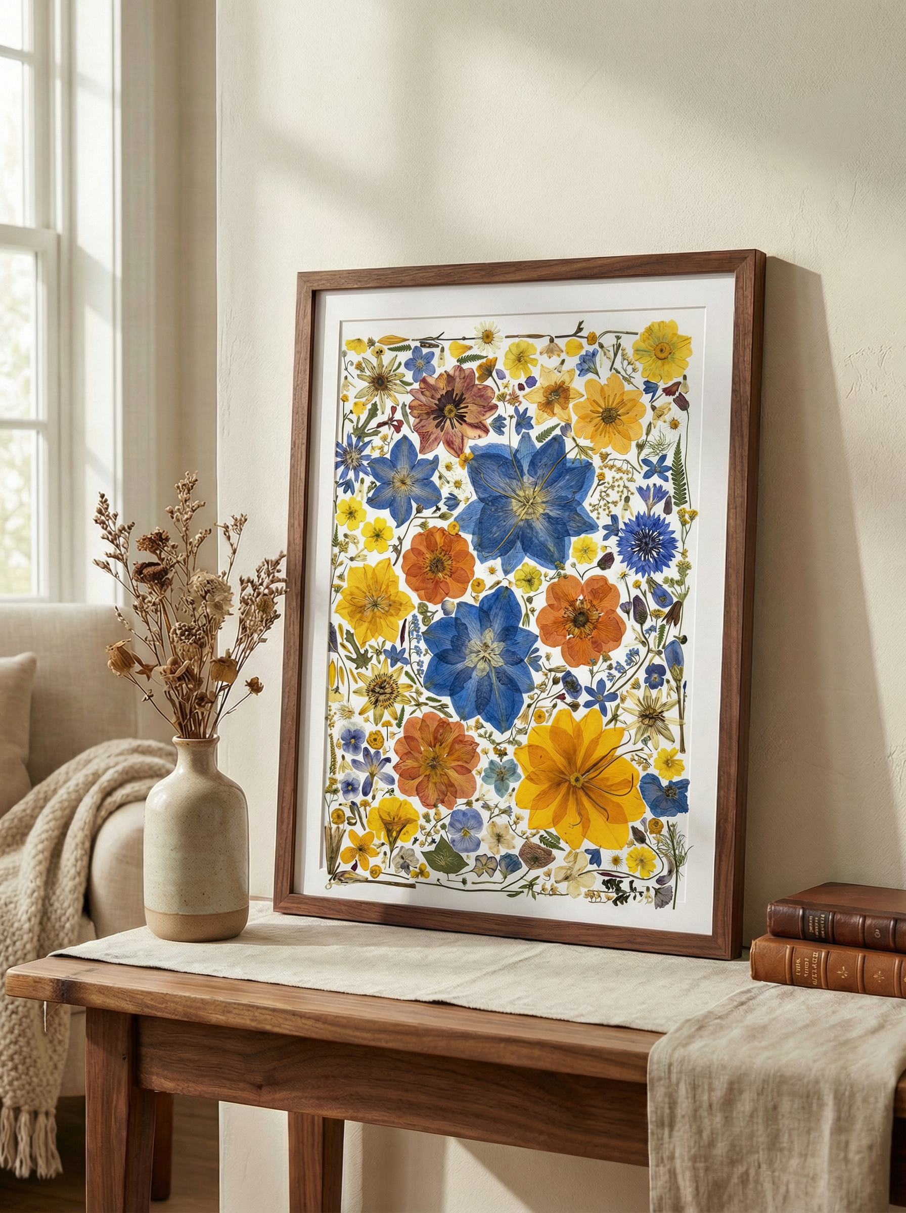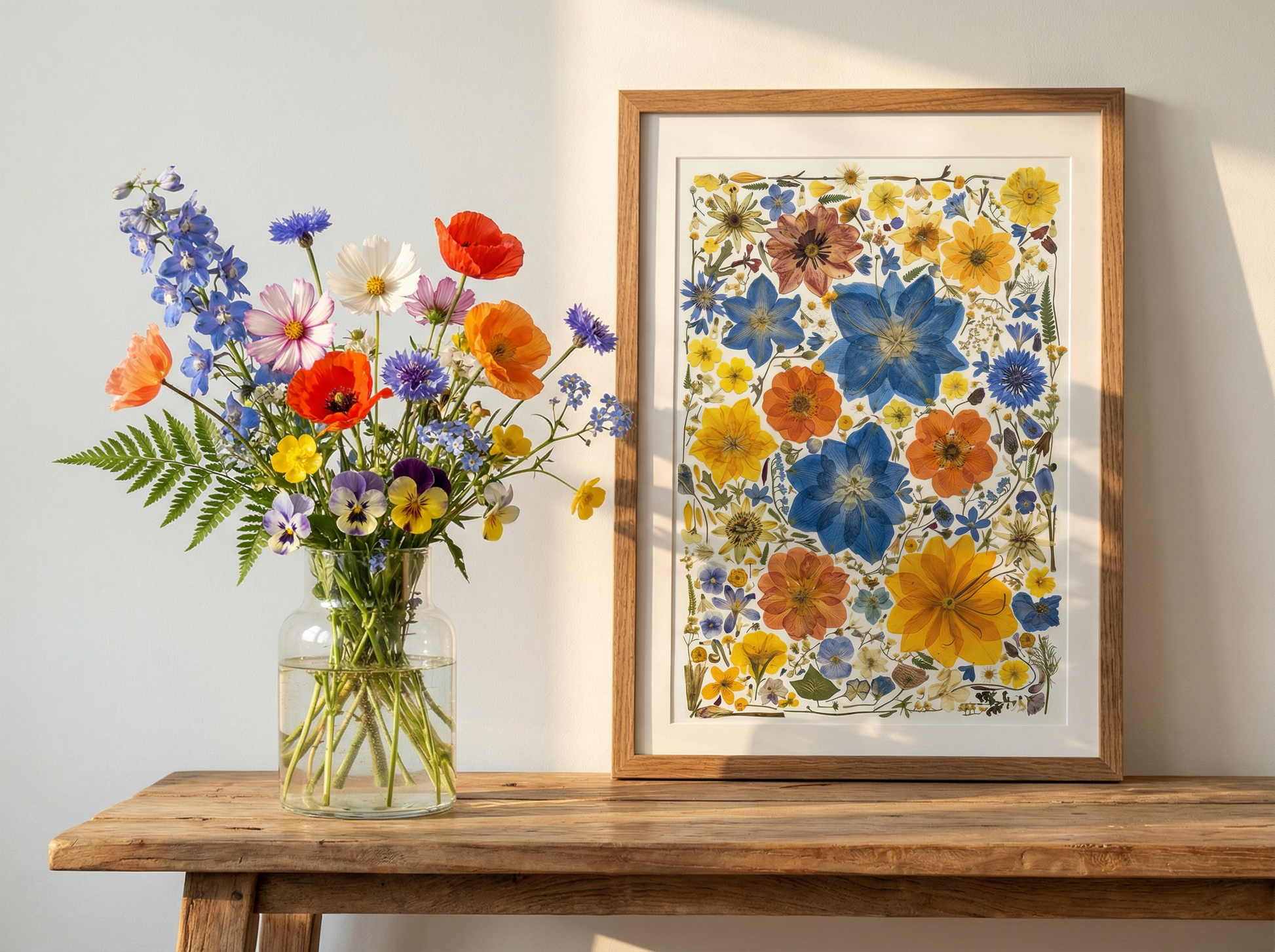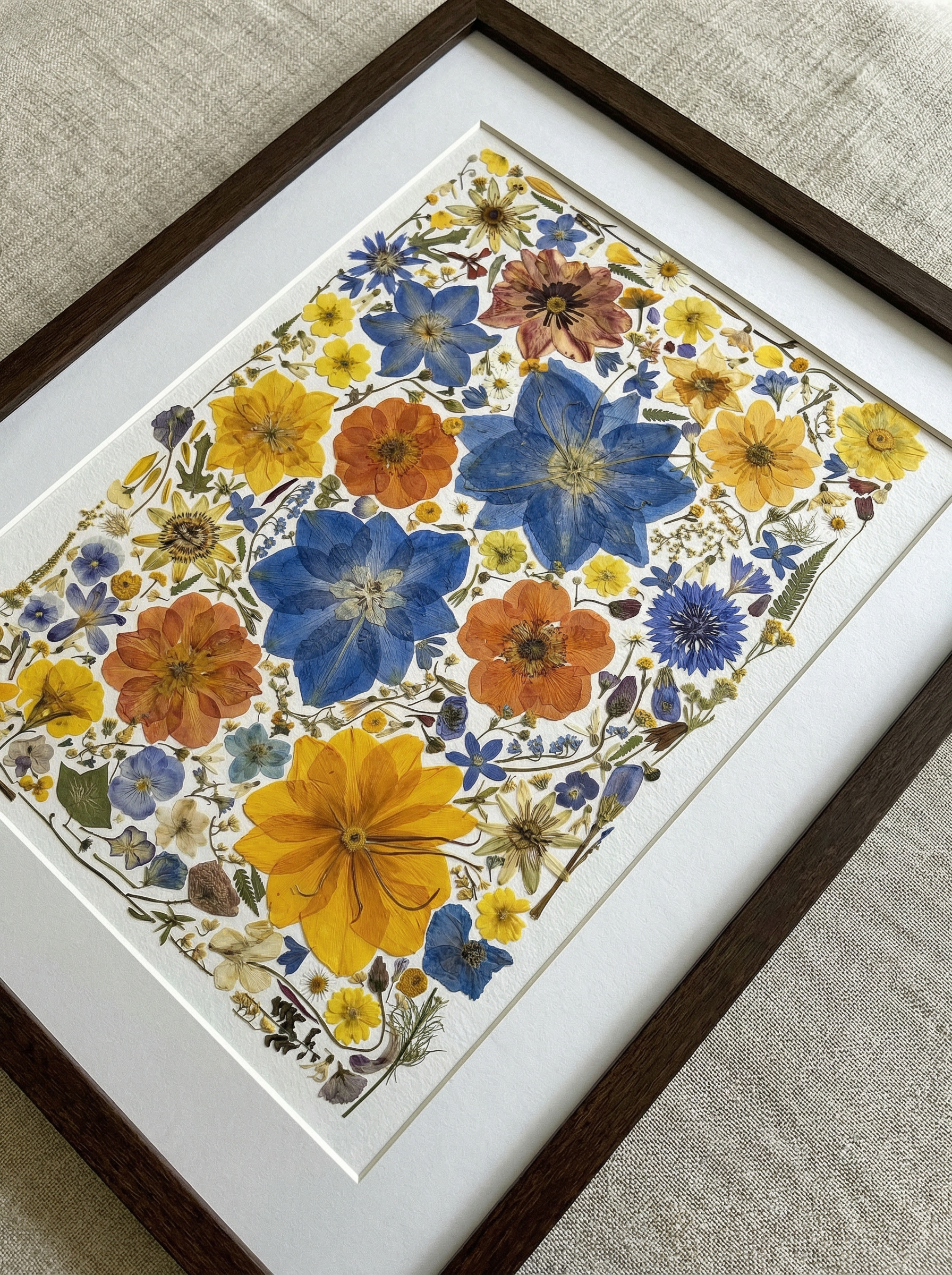 ▪ Dettagli del prodotto: La cornice "Serenata del Prato" presenta una raffinata composizione di fiori pressati, evidenziando l'Ancolia blu e i Papaveri arancioni, elegantemente completati da Fiordalisi e Viole del pensiero. Delicati Non ti scordar di me sono sparsi tra piccole margherite gialle e bianche, il tutto incorniciato da sottili fronde di felce. Ogni elemento è meticolosamente conservato per catturare l'essenza di un prato selvatico.