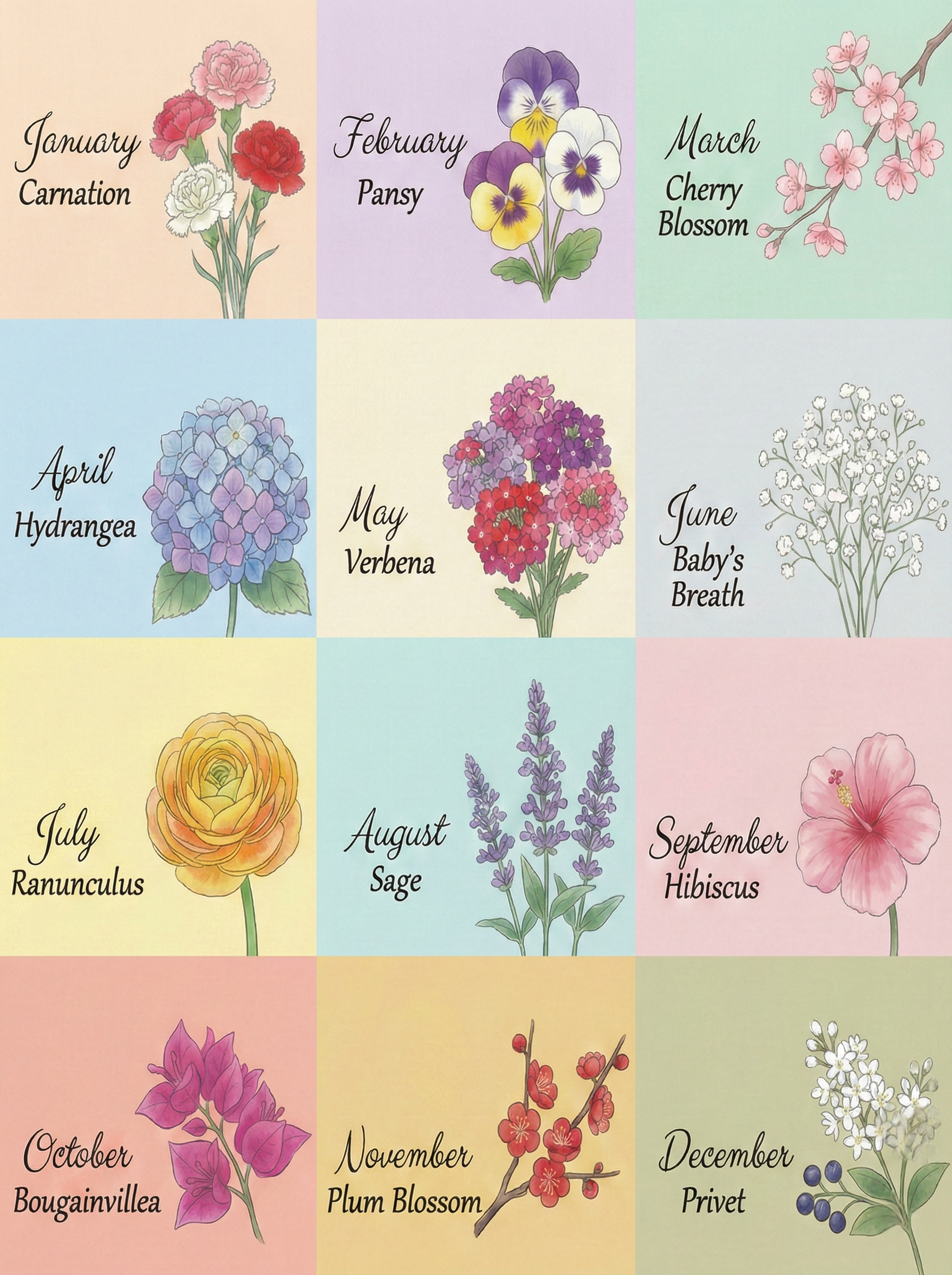 ▪ Materiali: Rose da giardino nei toni rosa e crema, margherite bianche, foglie di eucalipto, delicate fronde di felce e fiori del mese di nascita.