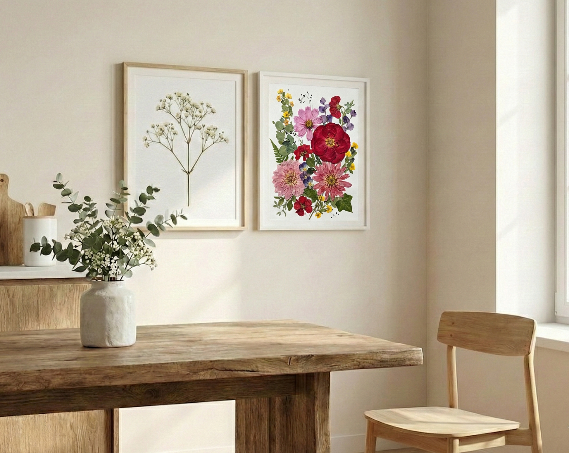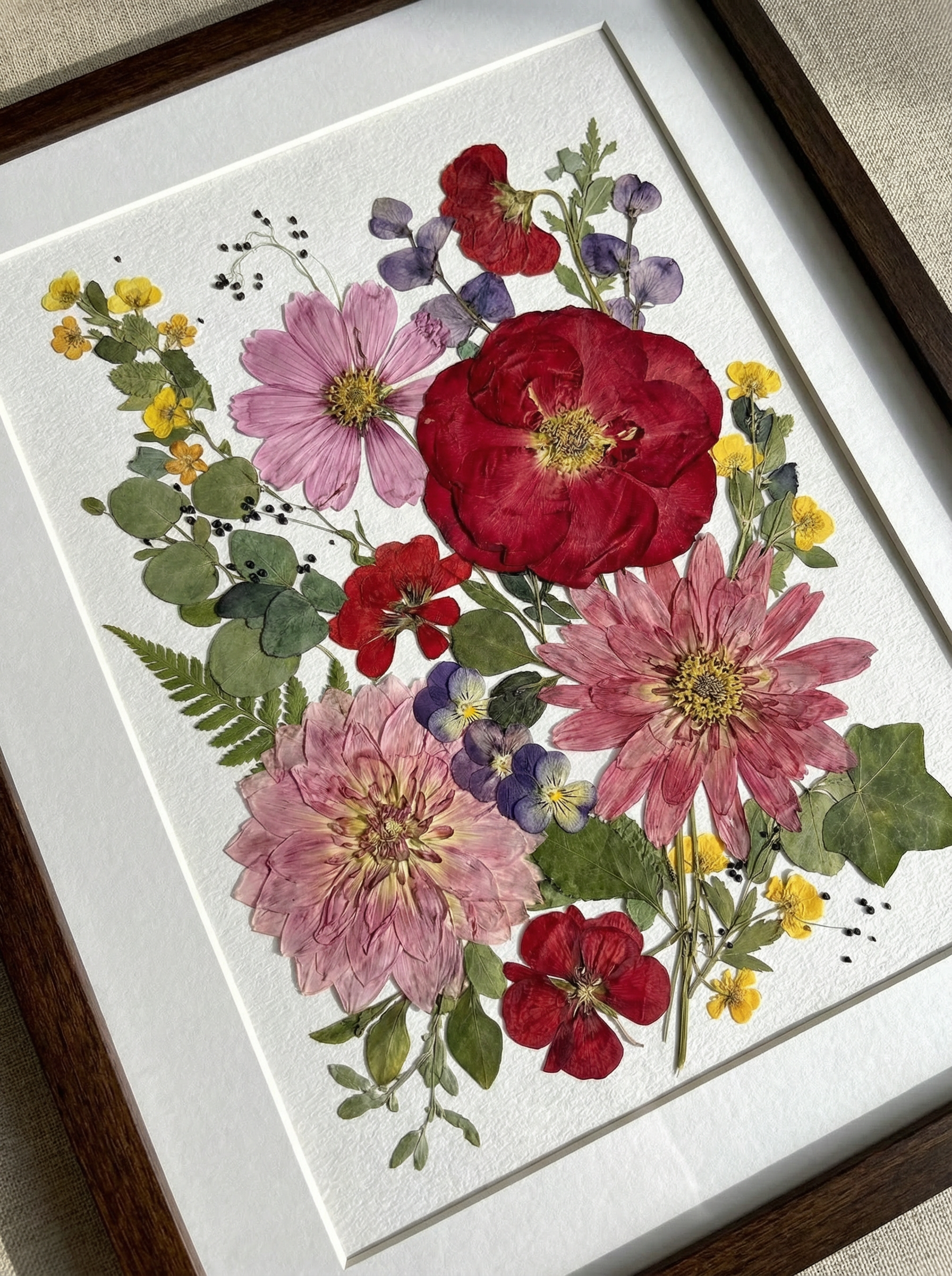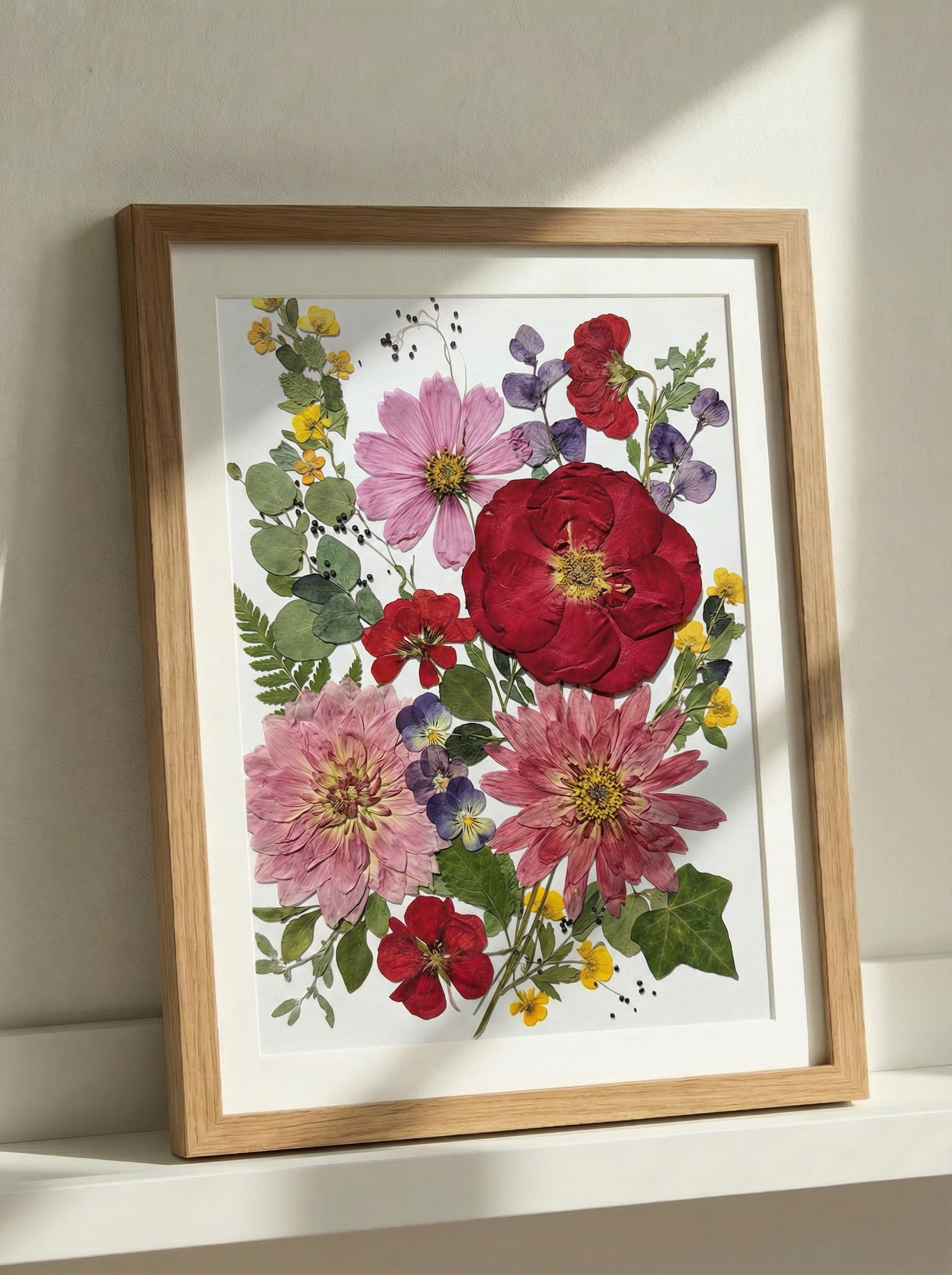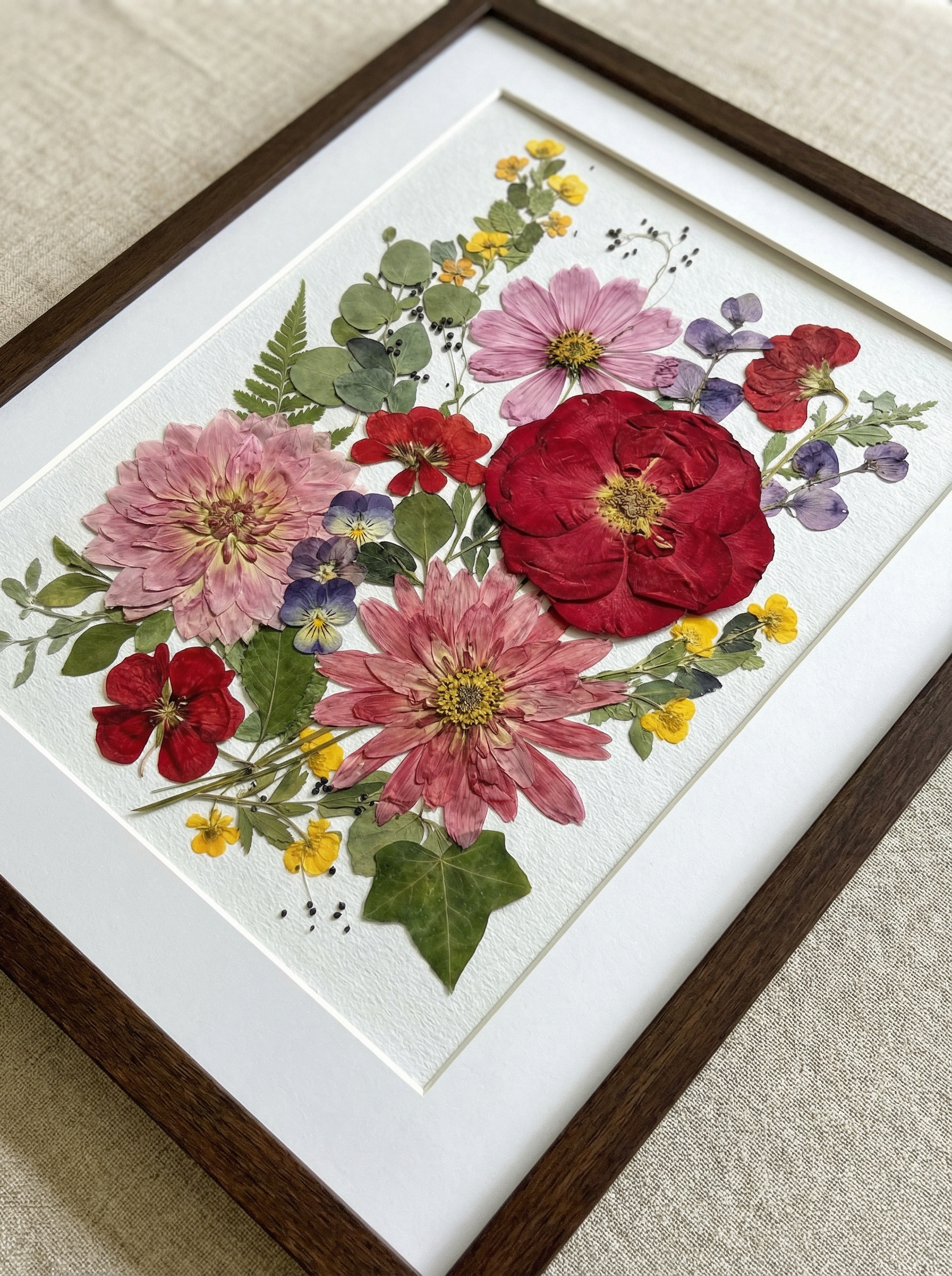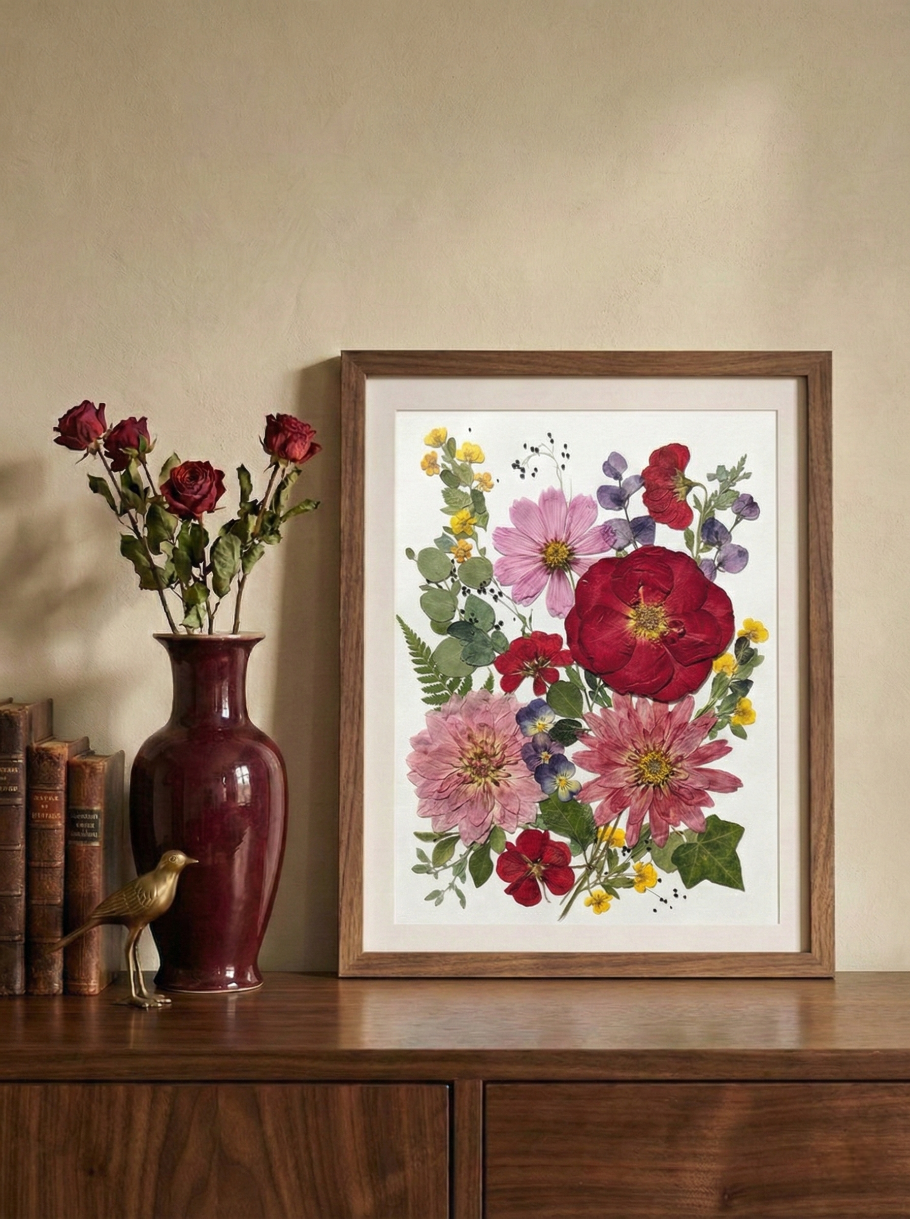 I nostri fioristi dispongono e incollano con cura petali di fiori essiccati su una base di carta, creando un design unico. Ogni petalo proviene dalle migliori fioriture stagionali, meticolosamente selezionate e pressate dai nostri esperti fioristi. L'opera è protetta da un pannello in acrilico trasparente e sigillata con un supporto in alluminio per aumentarne la longevità e preservarne la bellezza botanica.