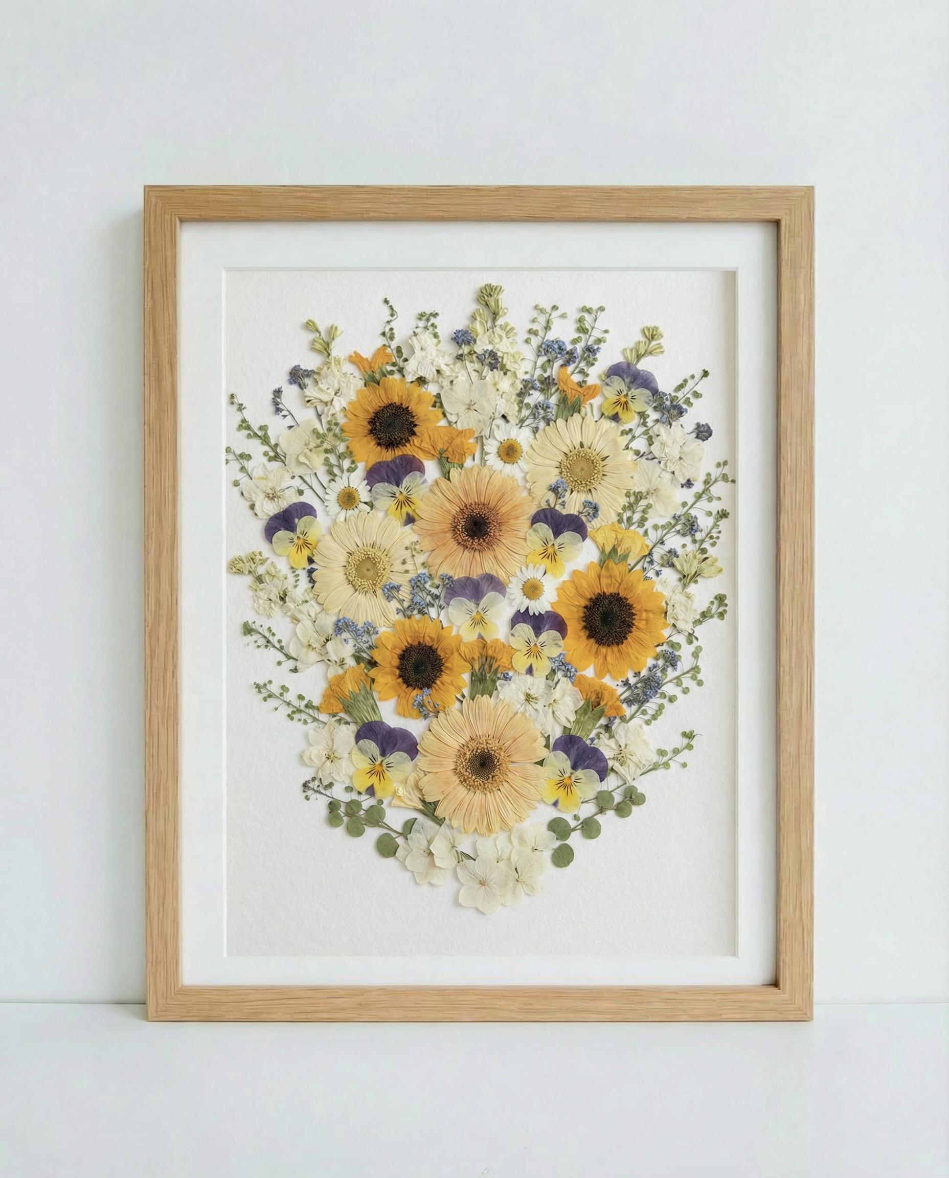 Our florist carefully arranges and glues dried flower petals onto background paper, creating a unique design. Each petal is sourced from the finest seasonal blooms, meticulously chosen and pressed by our skilled florists.