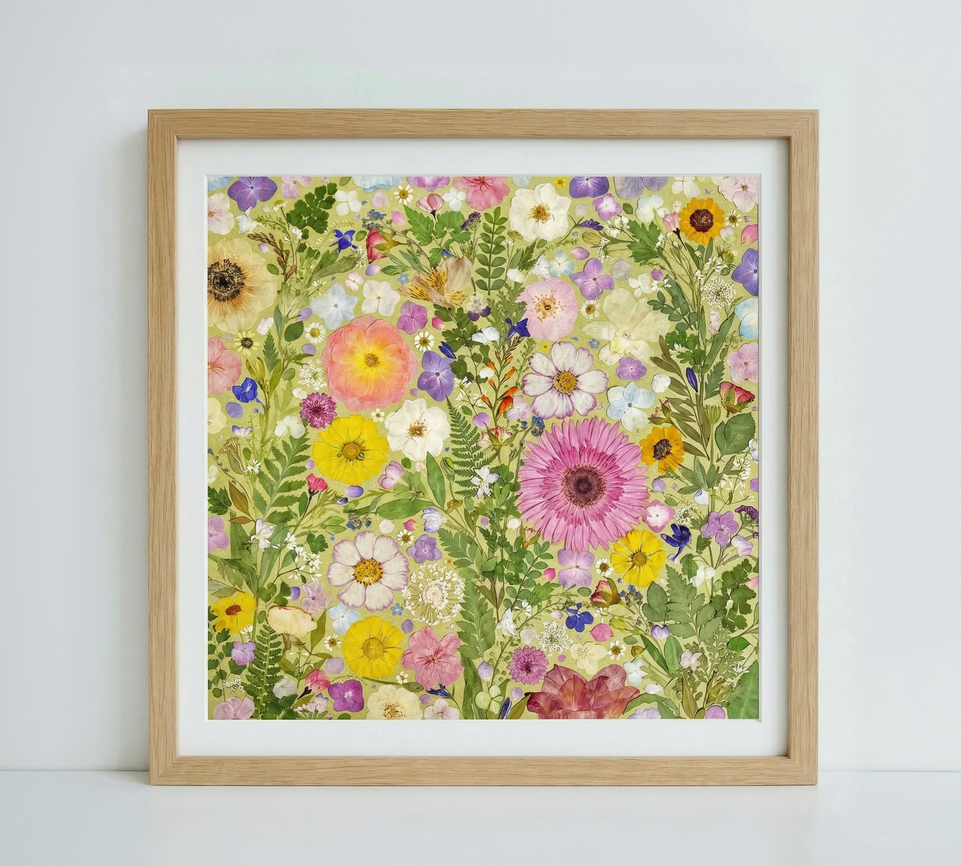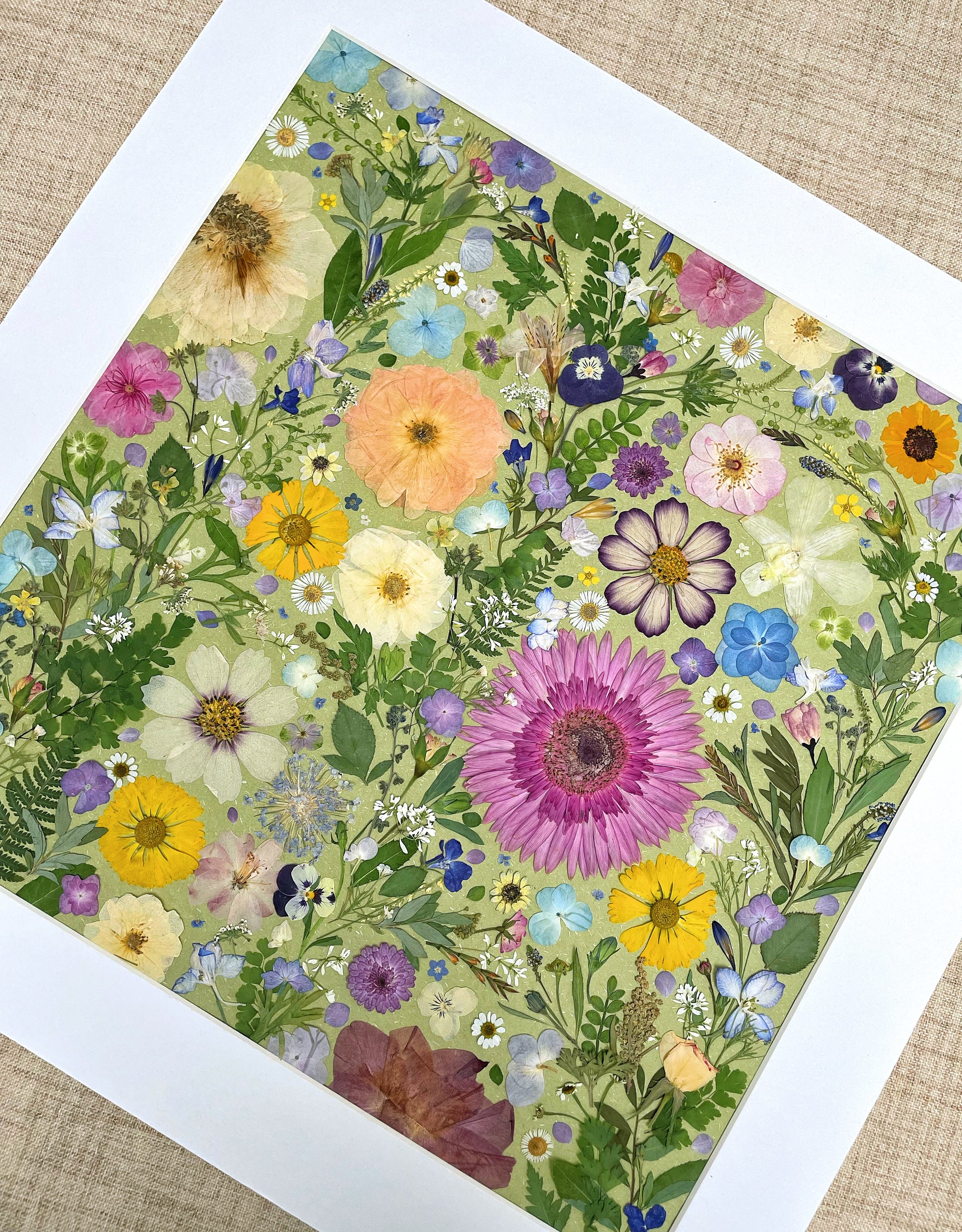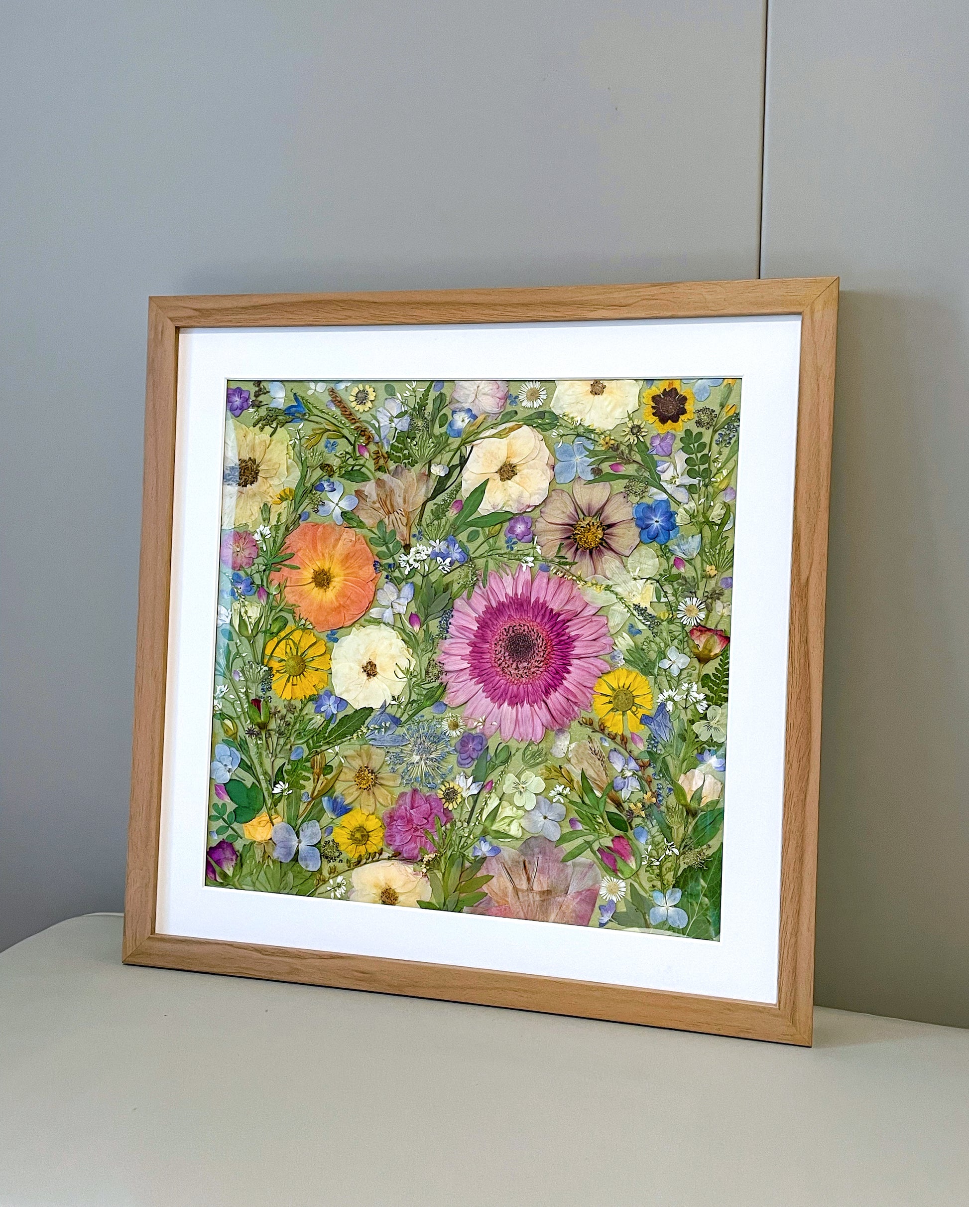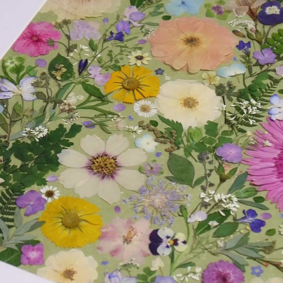 This is a large-sized pressed floral frame artwork. Our florist carefully arranges and glues dried flower petals onto background paper, creating a unique design. Each petal is sourced from the finest seasonal blooms, meticulously chosen and pressed by our skilled florists.