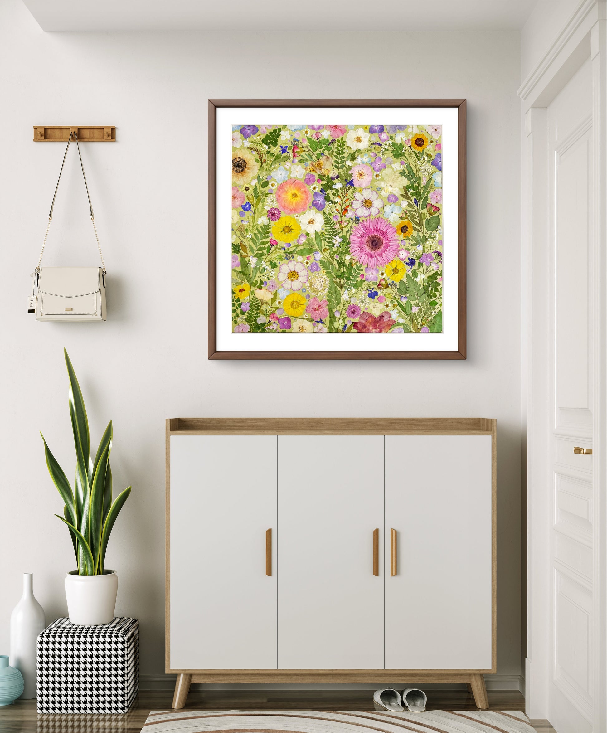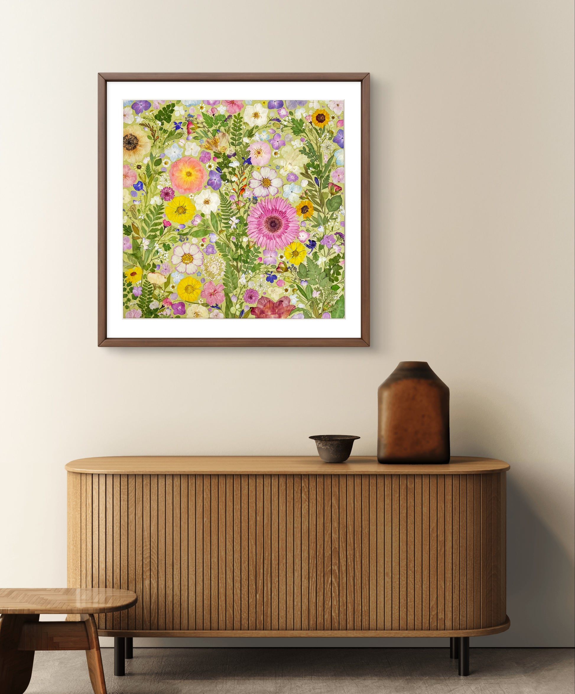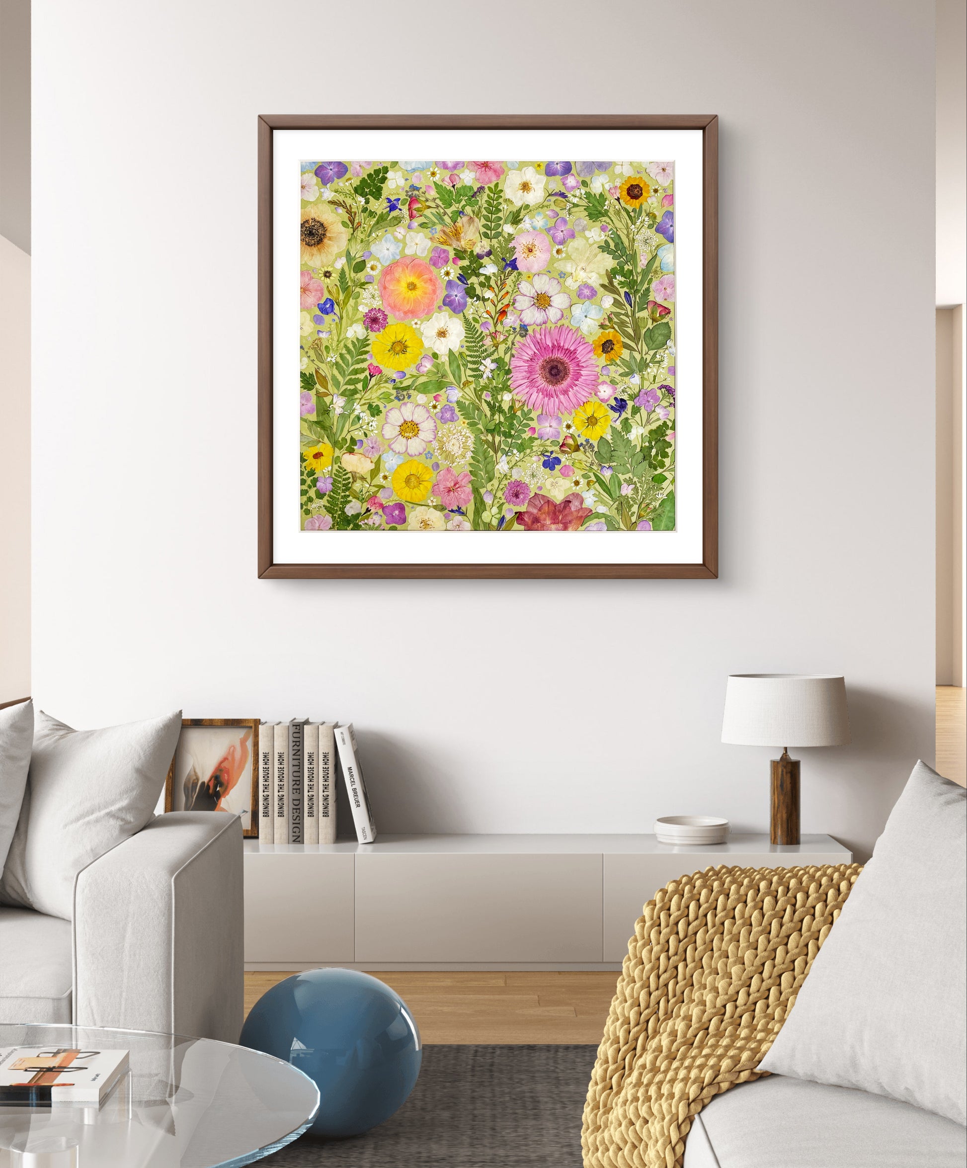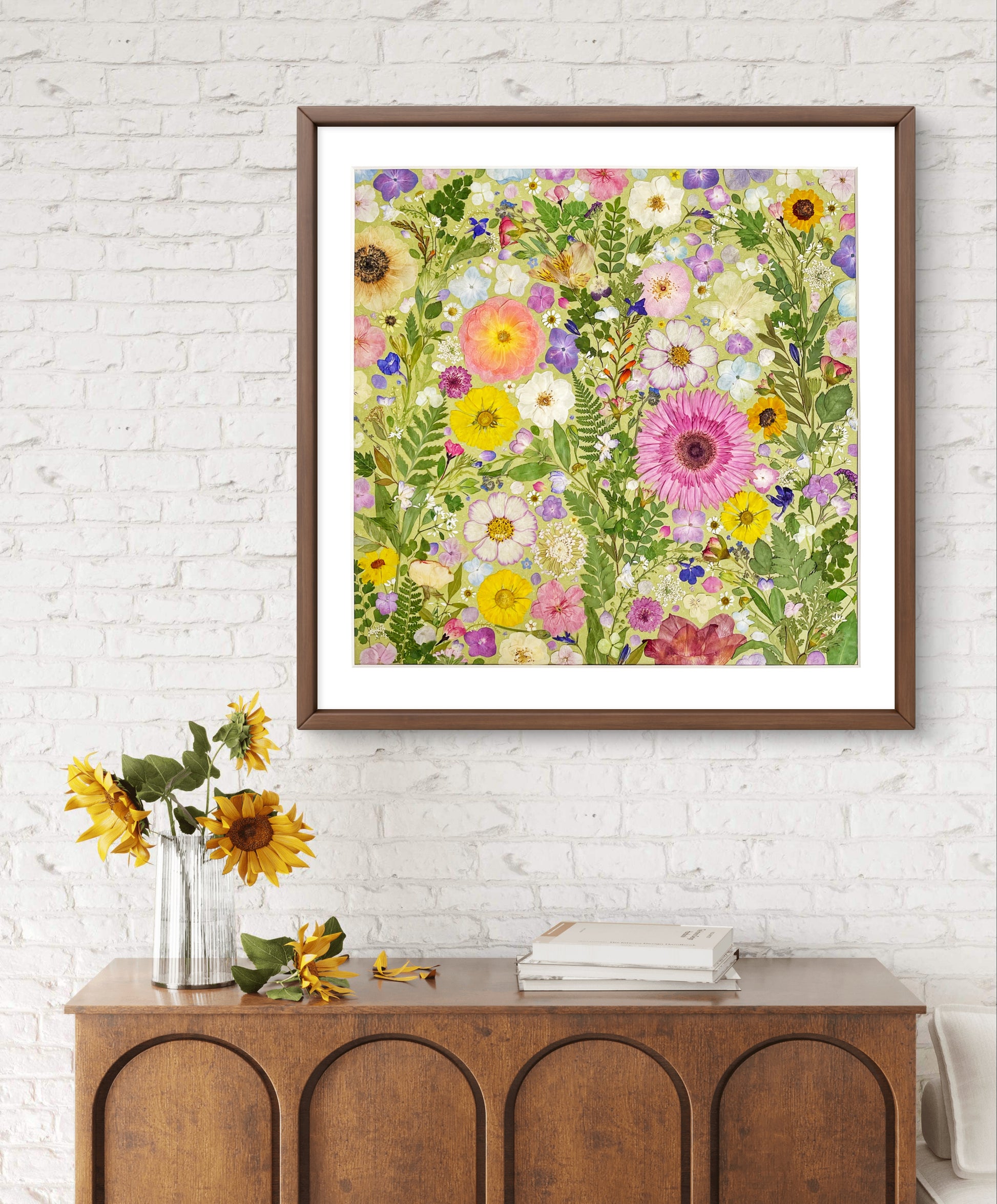 This is a large-sized pressed floral frame artwork. Our florist carefully arranges and glues dried flower petals onto background paper, creating a unique design. Each petal is sourced from the finest seasonal blooms, meticulously chosen and pressed by our skilled florists.
