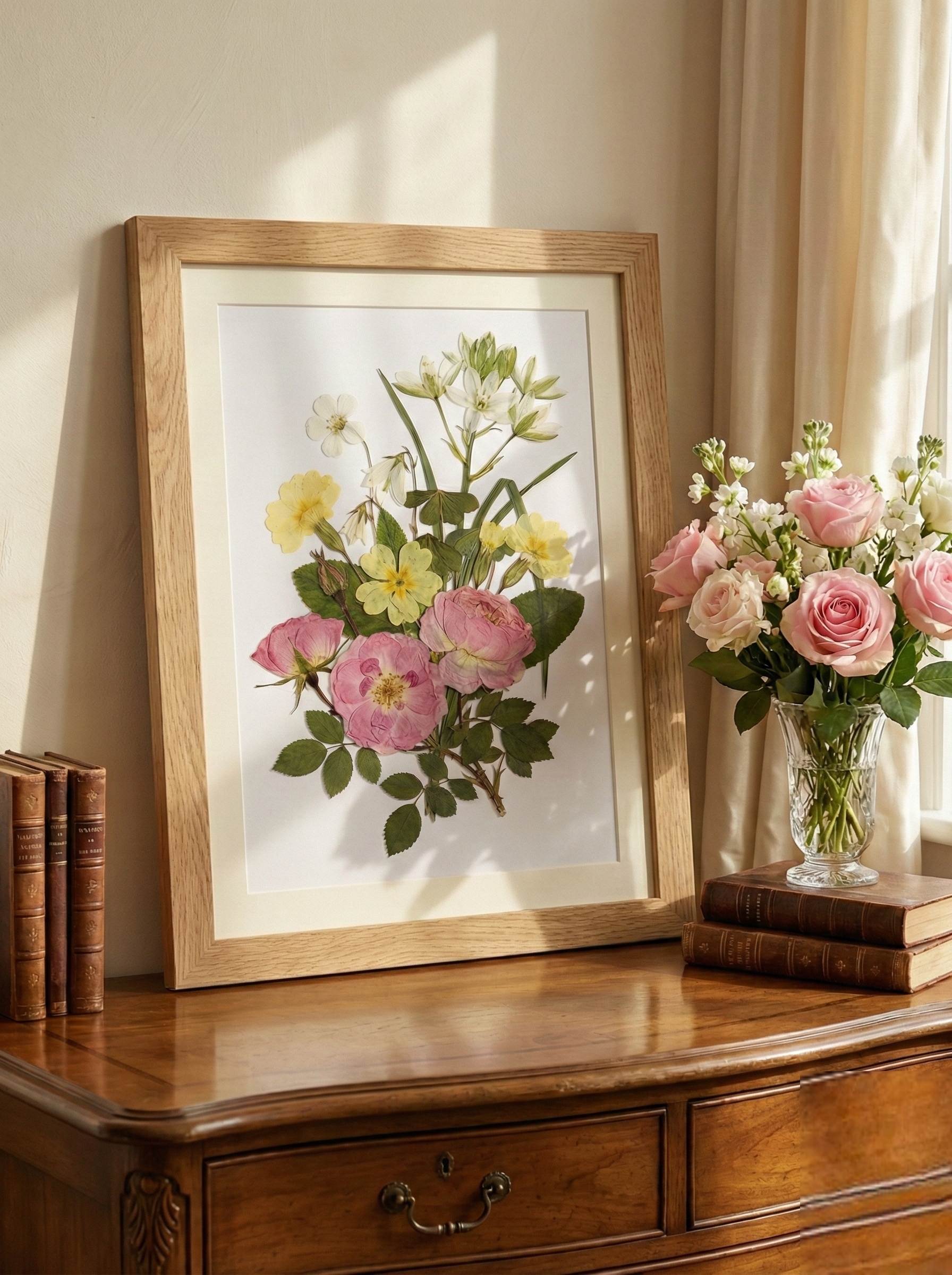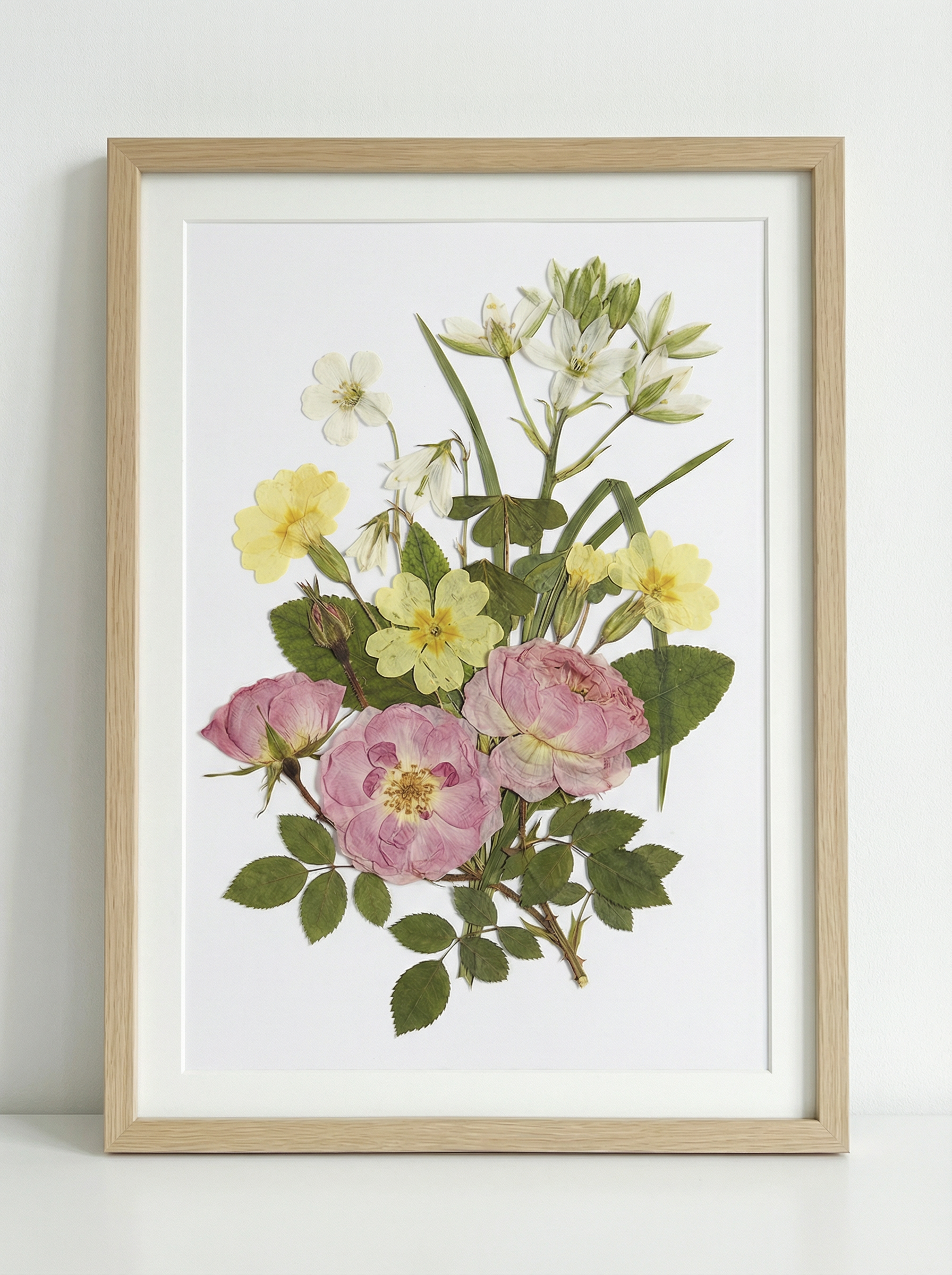 I nostri fioristi dispongono e incollano con cura petali di fiori essiccati su una base di carta, creando un design unico. Ogni petalo proviene dalle migliori fioriture stagionali, meticolosamente selezionate e pressate dai nostri esperti fioristi. L'opera è protetta da un pannello in acrilico trasparente e sigillata con un supporto in alluminio per aumentarne la longevità e preservarne la bellezza botanica.