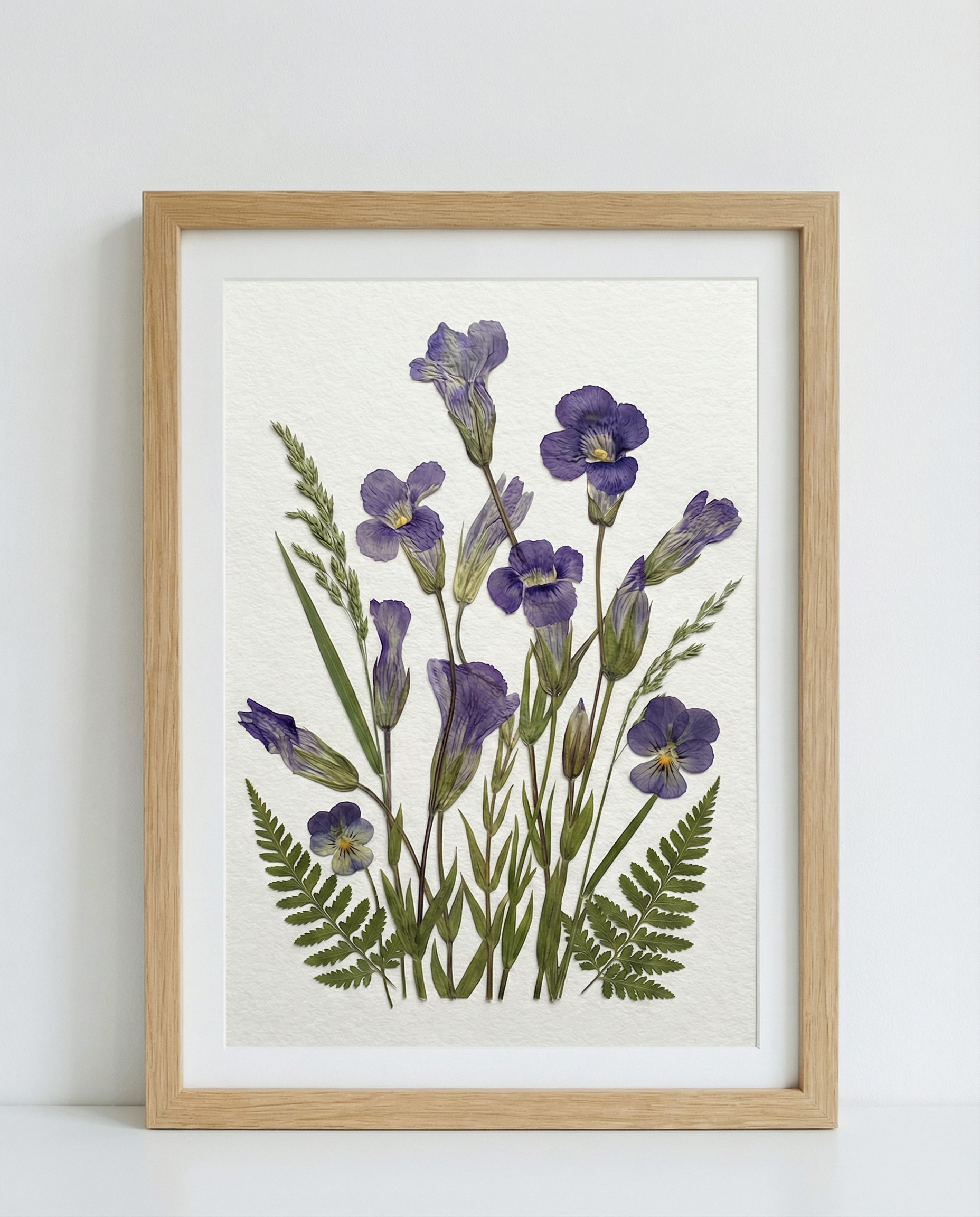 ▪ Materiali: campanule viola, viole del pensiero viola, fronde di felce e sottili foglie di erba selvatica.